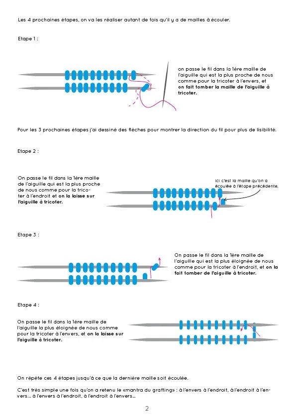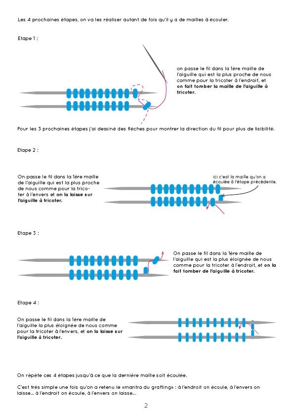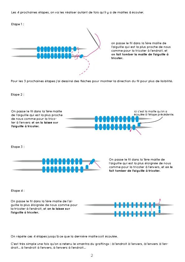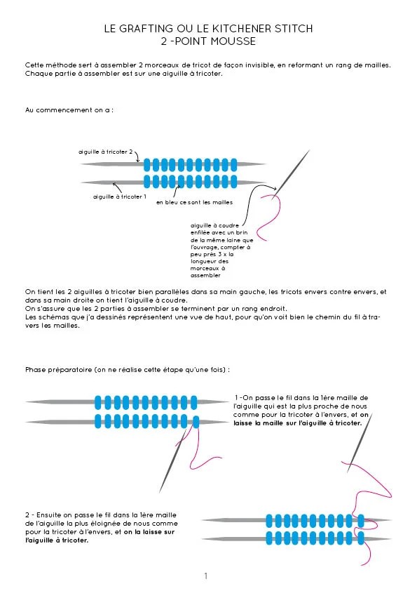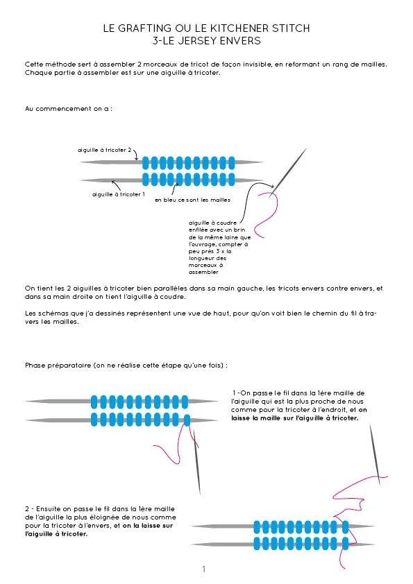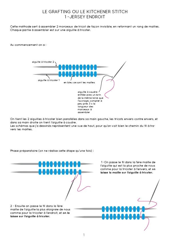 C’est une technique d’assemblage invisible que j’utilise parfois dans mes tricots, alors j’ai réalisé des « fiches grafting »car c’est inexplicable en 3 lignes sans schéma dans un patron.