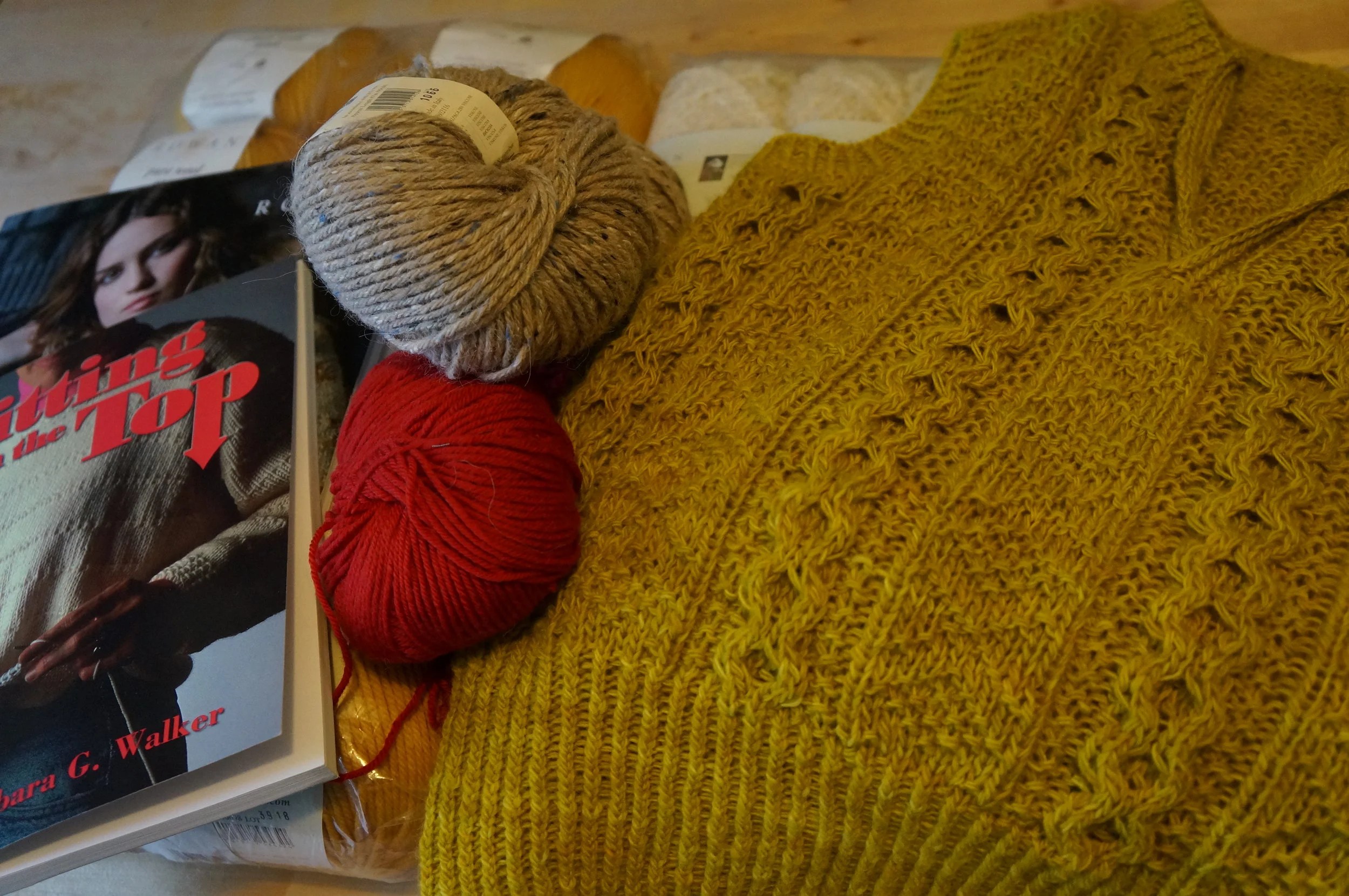 Déjà c’était les soldes. J’ai donc rapporté 2 gros sacs de laine Rowan, de la pure wool Aran et de la British sheep Breeds Bouclée (ça sent le cardigan tout doux). Mais aussi 2 pelotes de mérinos super douce rouge pour faire un bonnet de Steve Zissou à Odilon, et 2 de Felted Tweed Aran pour me faire un bonnet de la fin de l’hiver. J’ai dégoté un super catalogue Rowan et le livre qui pourrait bien être mon livre de chevet tricot de 2014 : Knitting from the top de Barbara G. Walker.