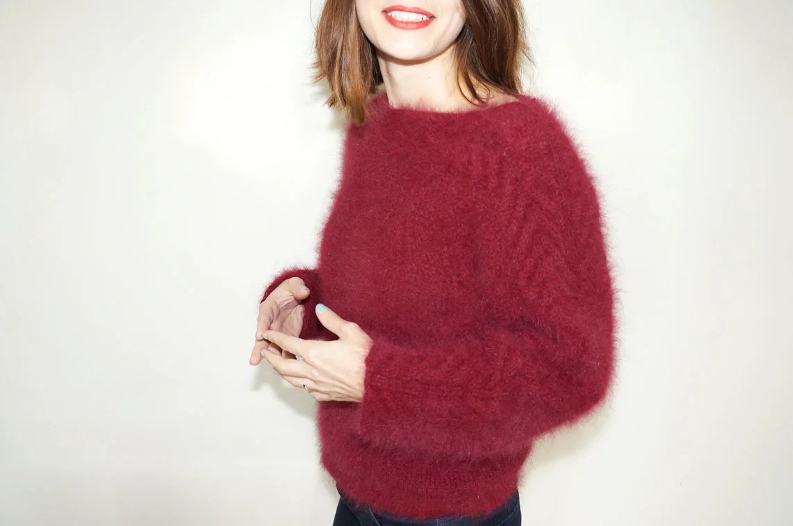 This design is inspired by the English fishermen sweaters in the patterns and in the construction, but it is all in angora wool!
