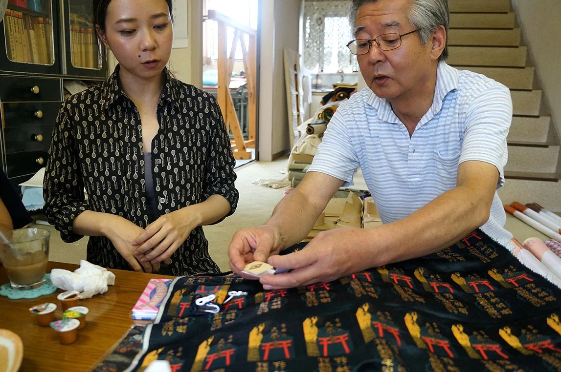 Yuka Takahashi and President Yoshimi Kagami in the Hikari Textile office. They show ,e a fabric used to make the lucky charms in the temple :