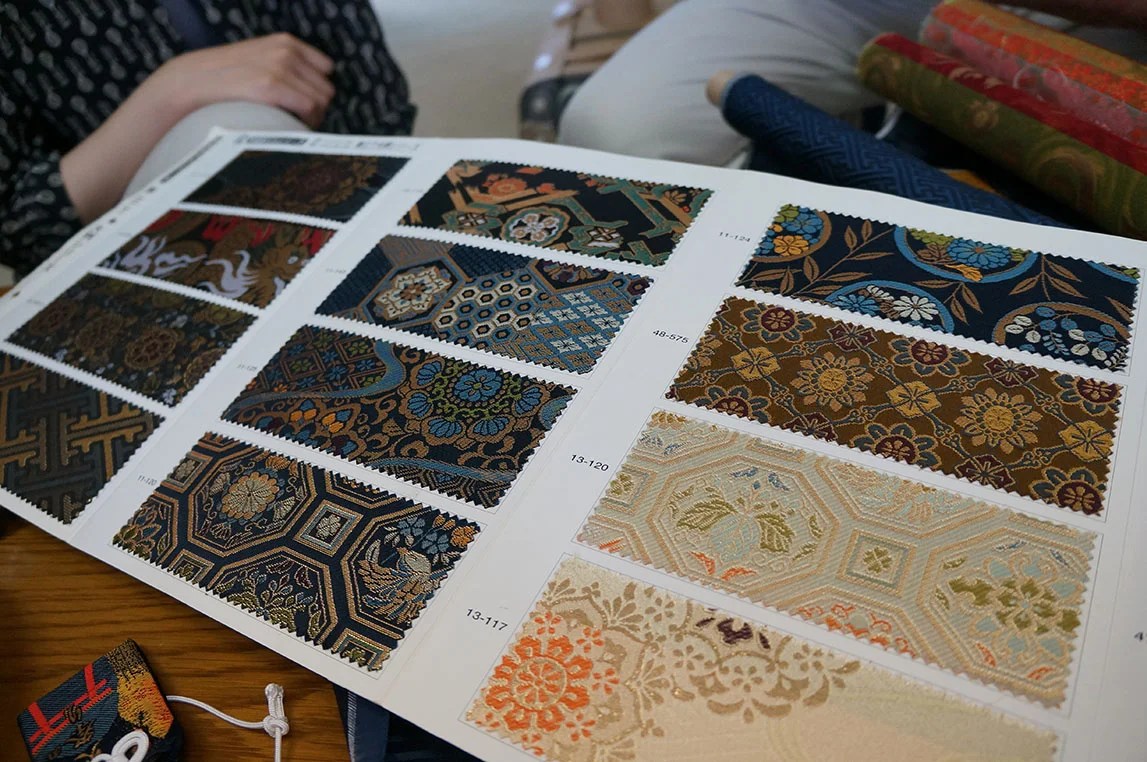 Yuka Takahashi et le président Yoshimi Kagami dans les locaux d’Hikari Textiles. Ils me montrent un tissu qui sert à emballer les porte bonheur au temple :