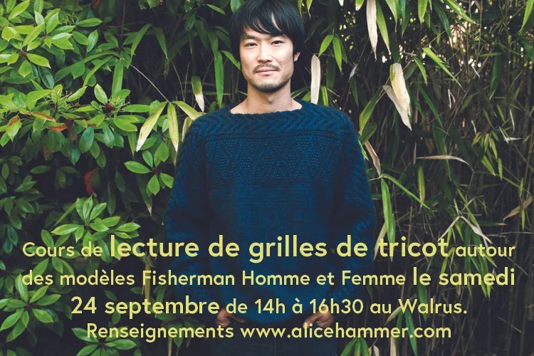 Les cours reprennent, si vous rêvez de dompter les grilles de tricot, ça se passera au Walrus le 24 septembre ! C’est une problématique qui revient souvent, je sais que certains d’entre vous ont le livre mais sont intimidés par les points et torsades présents il est vrai sur la grande majorité des modèles. On s’appuiera sur les modèles Fisherman homme et femme. Tous les renseignements sont ici sur mon site.