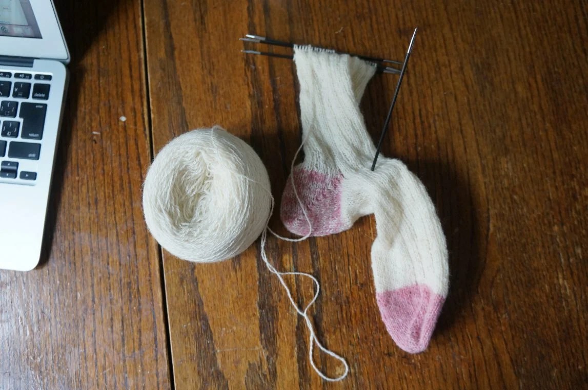 En tous cas je tricote je tricote, j’ai plusieurs modèles avec La Droguerie en test : un pull chaussette pour femme en alpaga, fin chaud et doux et tout et tout. C’est assez classique mais c’est le genre de pull que je porterais tout l’hiver. (Gunjin en pull chaussette)