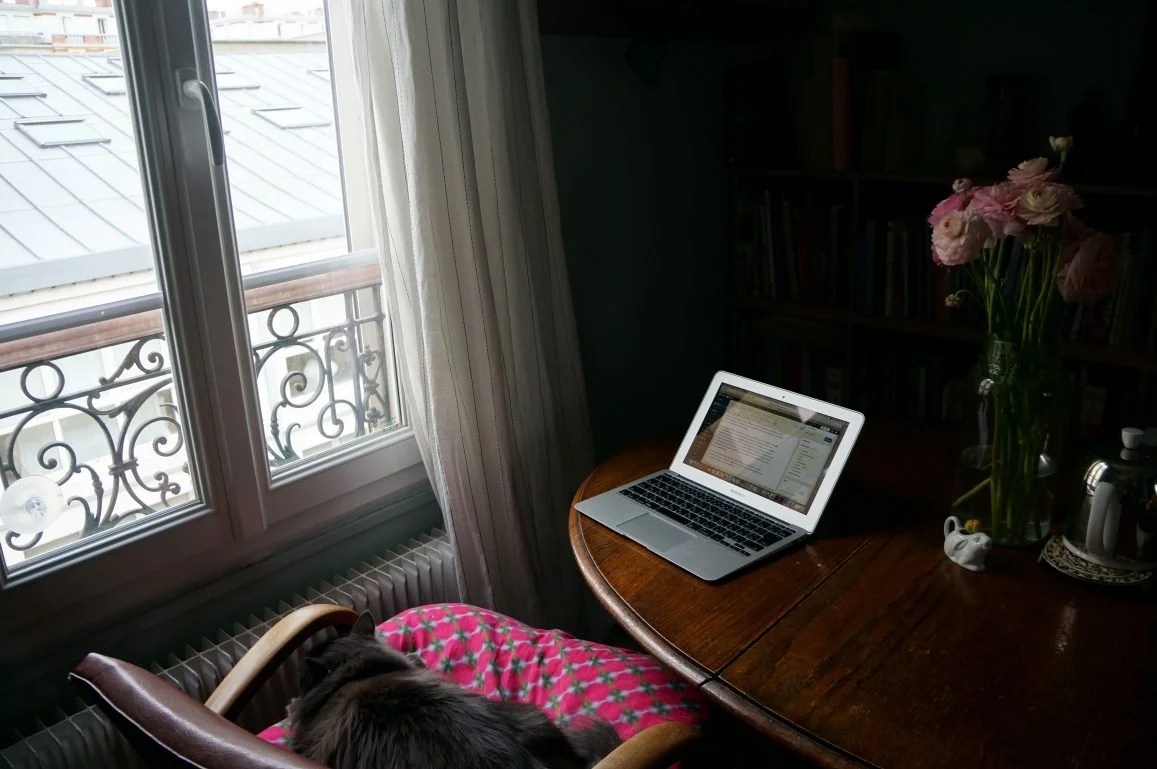 Bonjour ! Ecrire me manque beaucoup, il faut que je trouve un moyen de caser une séance hebdomadaire de bloguage dans mon emploi du temps. J’ai été un peu chamboulée dans mon organisation par un truc tout nouveau : je ne travaille plus de chez moi. Or pour écrire j’aime être chez moi, le matin, près de la fenêtre, sur le petit ordinateur portable, sur la table avec des pieds tournés en spirale sur lesquels je peux gratter les miens (de pieds) en même temps . Pour tout le reste j’aime être à mon bureau, sur le grand ordinateur. (là où j’aime écrire)