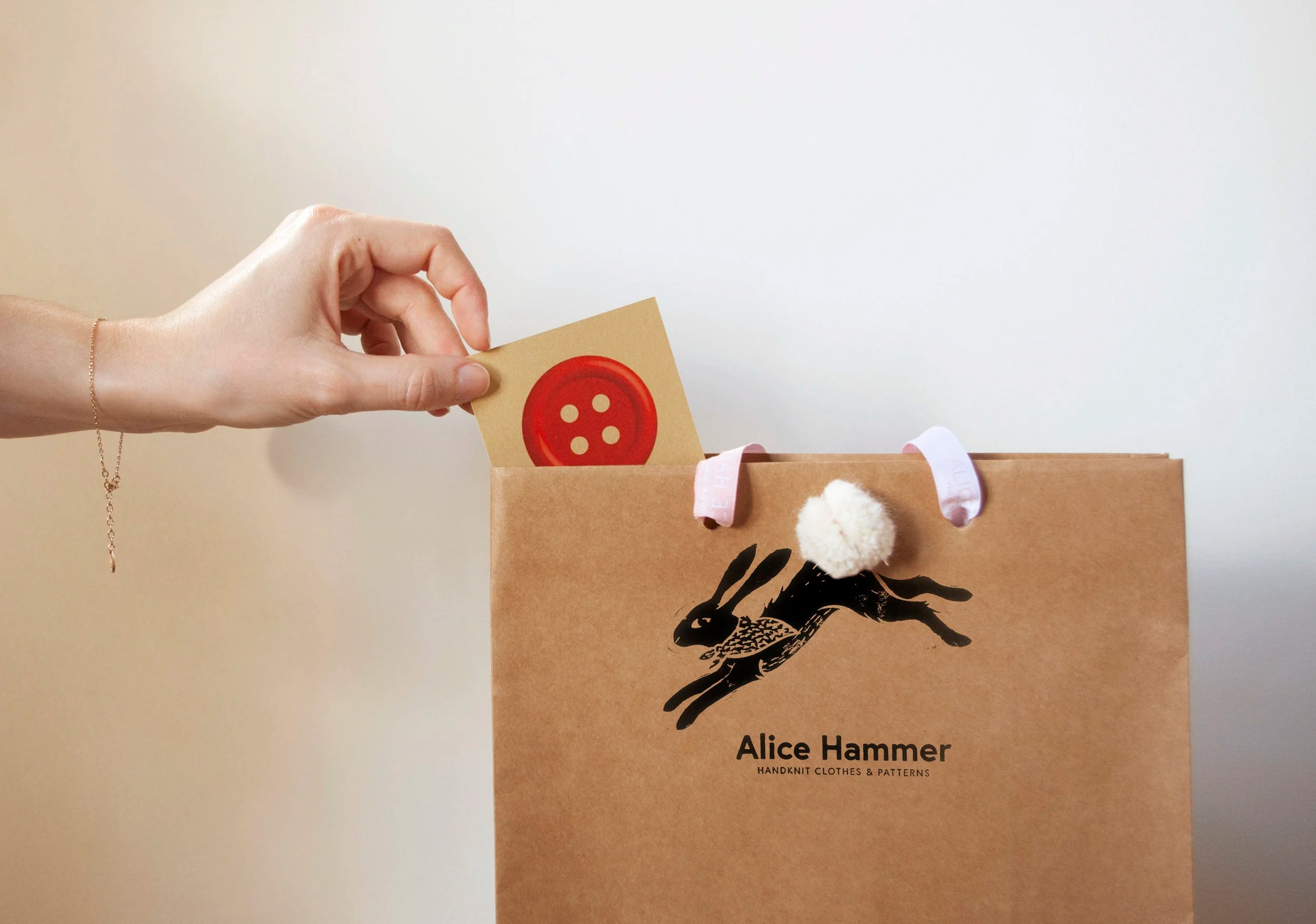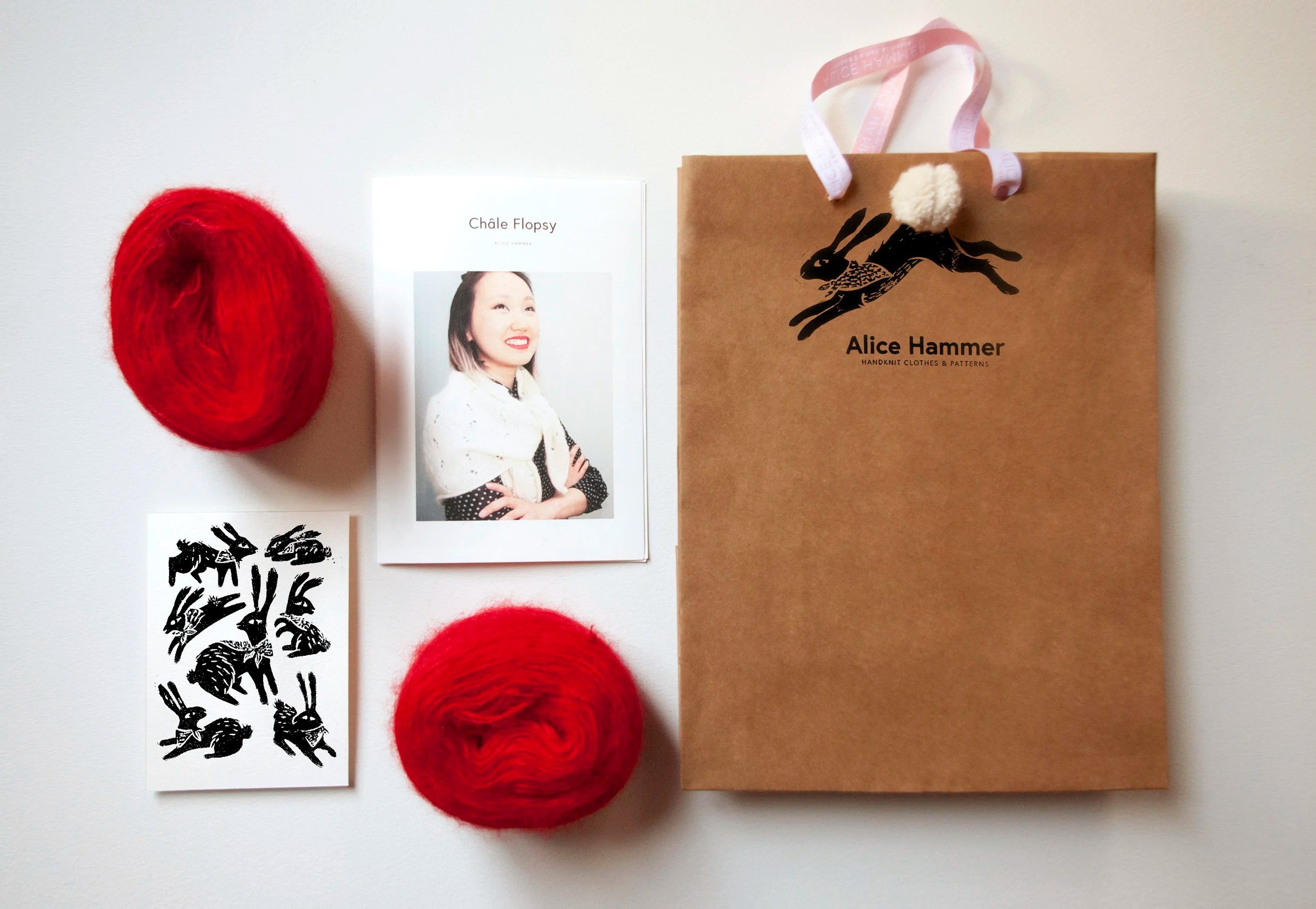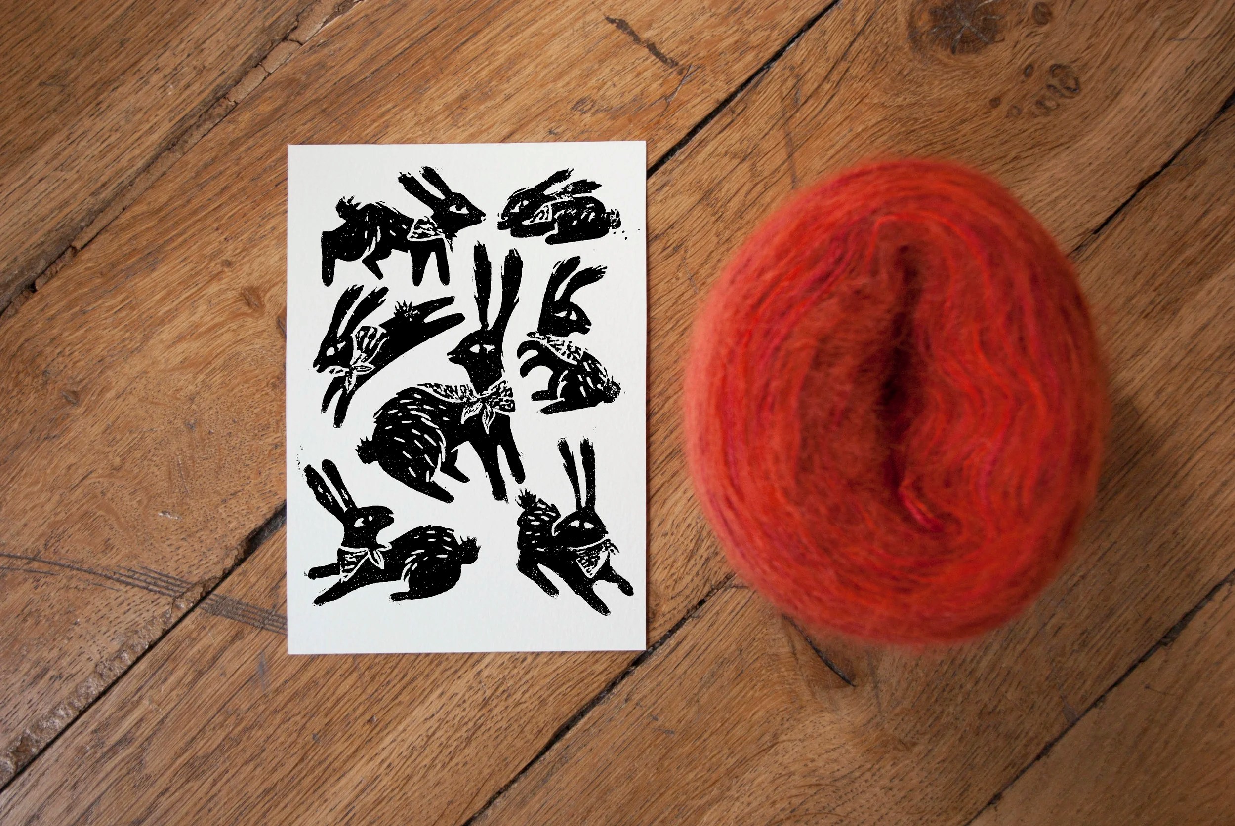 Déjà, il y a le fil. C’est de l’alpaga / plumette, c’est super, c’est beau, c’est doux, ça gonfle au blocage. Il y a bien évidemment le patron, que nous avons imprimé sous forme de livret sur du papier qu’on aime bien. Il y a également une petite carte linogravée par Amandine et numérotée, si vous voulez un Amandine Delaunay original, c’est l’occasion ! On a aussi fait un emballage linogravé et pomponé par mes soins.