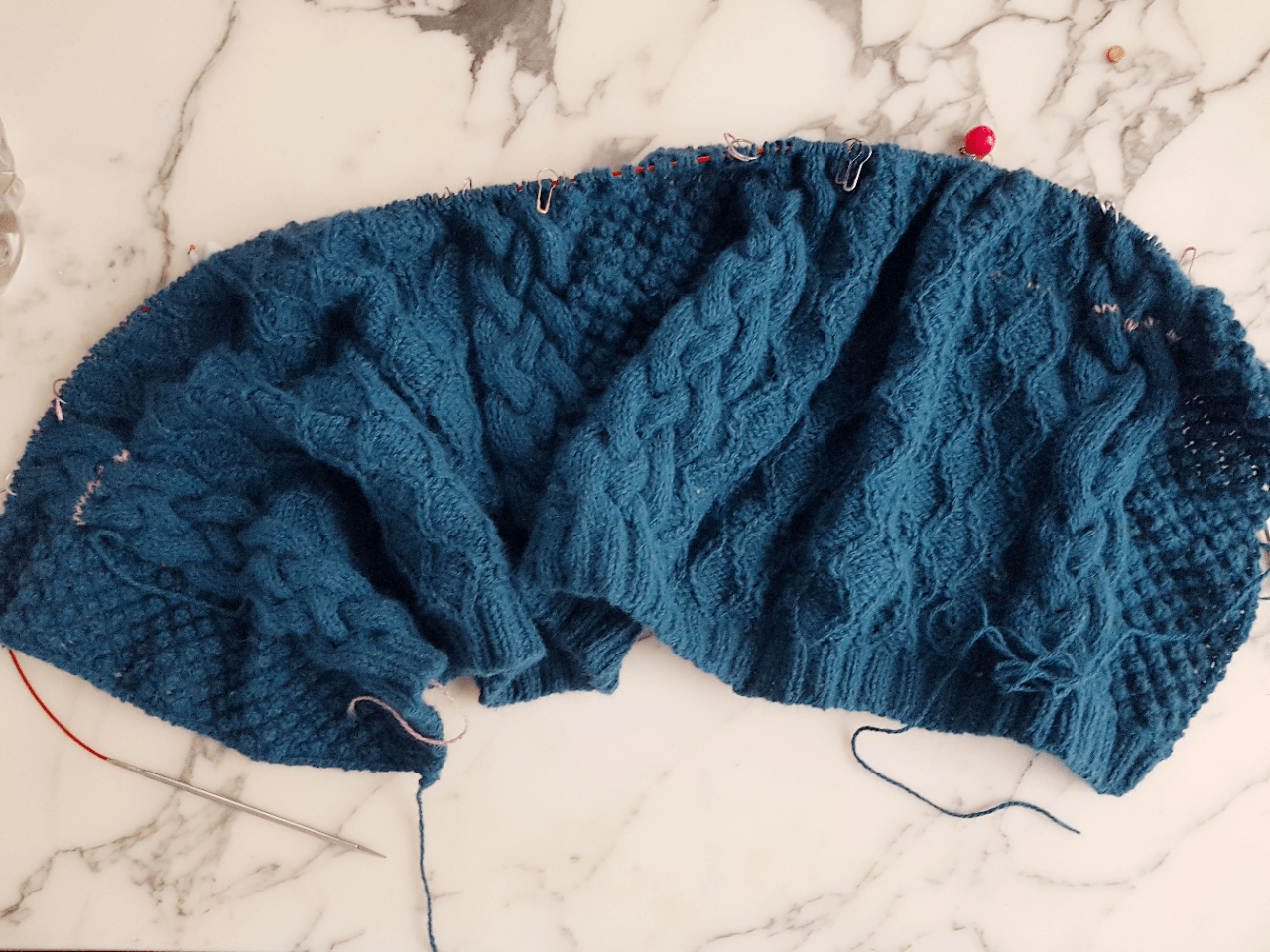 J’avance sur mon truc vert et torsadé, pas assez vite à mon gout mais je viens de souscrire à un abonnement à Netflix pour tenter d’augmenter le rendement. Si vous avez des films et séries de prédilection qui vous font avancer le tricot je prends les suggestions ! Vous noterez que j’ai fait une petite erreur dans une des torsades (à droite du tricot)… Je me suis tatée, est-ce que de défais ou pas, mais j’ai décrété que je l’aimais cette petite erreur. Elle ne rend pas le cardigan plus moche, elle me rappellera juste que c’est moi qui l’ai fait avec amour et qu’à ce moment là je me suis trompée et puis c’est tout.