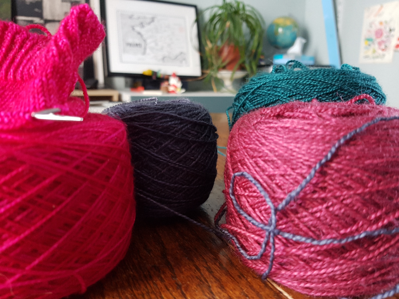 La mauvaise nouvelle, c’est que j’ai retrouvé un début d’une autre paire de chaussettes qui se planquait dans un tiroir de mon bureau. Elle n’est vraiment pas très avancée et je pourrais la défaire mais comment résister à cette couleur magique ? C’est le Aimée’s Lipstick de la Bien Aimée et vous pouvez même lui demander la référence du rouge à lèvres Chanel assorti. 3 pelotes de Triskelion et à gauche la rose fourbe qui se cachait dans le tiroir …