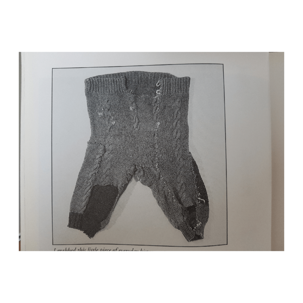 Nous avons eu 2 gagnantes : l’une a trouvé le nom et l’utilisation de ce vêtement, l’autre sa fabrication. Il s’agit d’un sous-vêtement appelé « Long John ». C’est tout simplement une sorte de culotte longue qu’on porte sous ses habits. On se dispute sur l’origine du mot car certains avancent qu’on l’appelle ainsi à cause de la culotte que portait le boxer John Lawrence Sullivan, et d’autres que l’appellation est plus ancienne et serait une déformation du français « longues jambes ». Celui-ci est assez particulier, si vous observez bien vous remarquerez que c’est en fait un pull Gansey retourné et customisé. Moi ça m’émeut, surtout en tant que tricoteuse, de voir à quel point on peut avoir un rapport intime avec les objets et combien on veut les faire vivre jusqu’au bout. On voit que ce tricot a été rapiécé plusieurs fois. C’est quand il n’était vraiment plus portable à l’extérieur qu’il est devenu sous-vêtement. J’adore cette idée qu’après avoir partagé plusieurs années avec son Gansey son propriétaire en a fait une culotte, soit une seconde-peau.