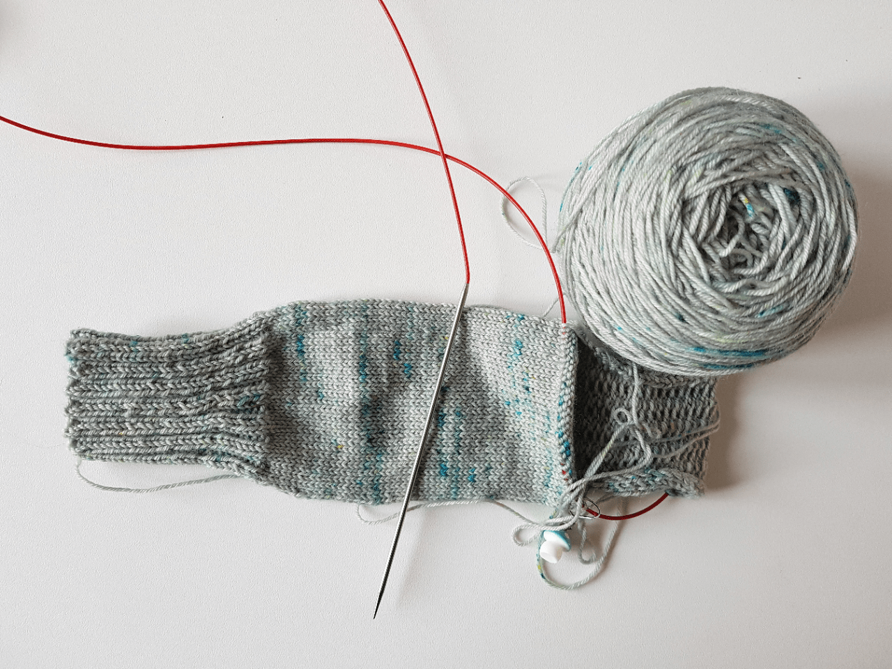 J’ai aussi un peu avancé dimanche soir sur ma chaussette des en-cours abandonnés, j’ai fini la cheville et fait un bout de talon. Je ne fais pas de points trop fantaisie, avec ce beau fil plus c’est simple et mieux c’est.