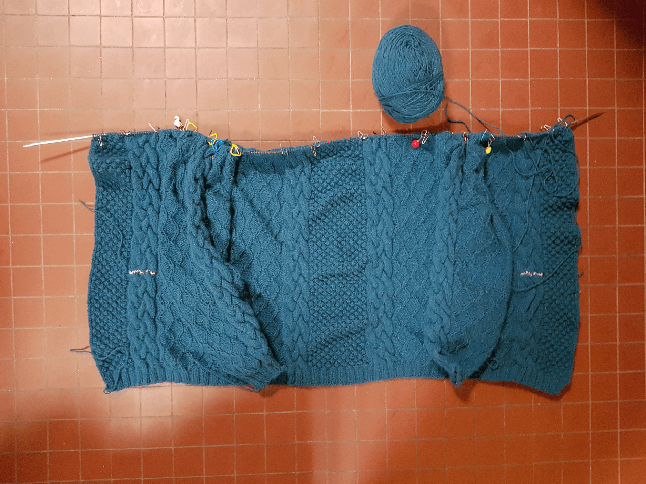 Faisons le point sur les en-cours ! Il faut que je vous parle d’un truc : grâce à quelques désistements, j’ai eu la chance de pouvoir m’inscrire au tournoi de Knittich 2017 organisé par Tricot et Stitch ! Je suis super contente j’ai été admise chez les Poufsouffle, ma maison préférée. J’ai concouru pour mon premier match avec le fameux cardigan vert plein de torsades, j’en suis à 5 rangs après la jonction corps et manches. Je vous dis pas comme j’ai serré les fesses en priant pour que ça tombe bon dans les motifs, mais miracle, ça tombe bon. C’était inespéré étant donné que je suis plutôt détendue du tricot, comme vous avez vu l’autre fois j’ai tendance à me dire qu’on est pas à une maille ni à une ânerie de torsade près. Maintenant les rangs sont longs mais ça va commencer à être marrant de voir l’empiècement se dessiner.