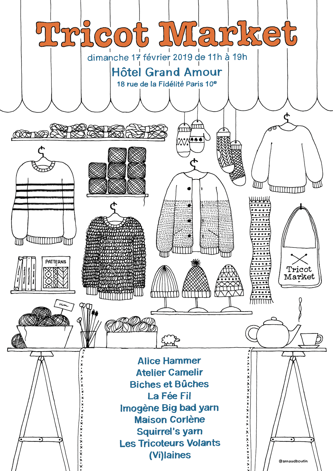 Ensuite il faut que je vous parle de la troisième édition du Tricot Market, qui se déroulera ce dimanche 17, toujours à l’Hôtel Amour. Si vous êtes déjà venus les deux précédentes fois, vous aurez le bonheur d’y retrouver Biches et Bûches, La Fée Fil, Big Bad Yarn, Maison Corlène, les Tricoteurs Volants et moi. Nous accueillons 3 nouvelles exposantes et on est très contents de vous donner l’occasion des les voir ce weekend parce qu’on adore leur travail. Il s’agit d’Atelier Camélir, Squirrel’s Yarn et (Vi)laines j’ai très hâte d’être à dimanche !