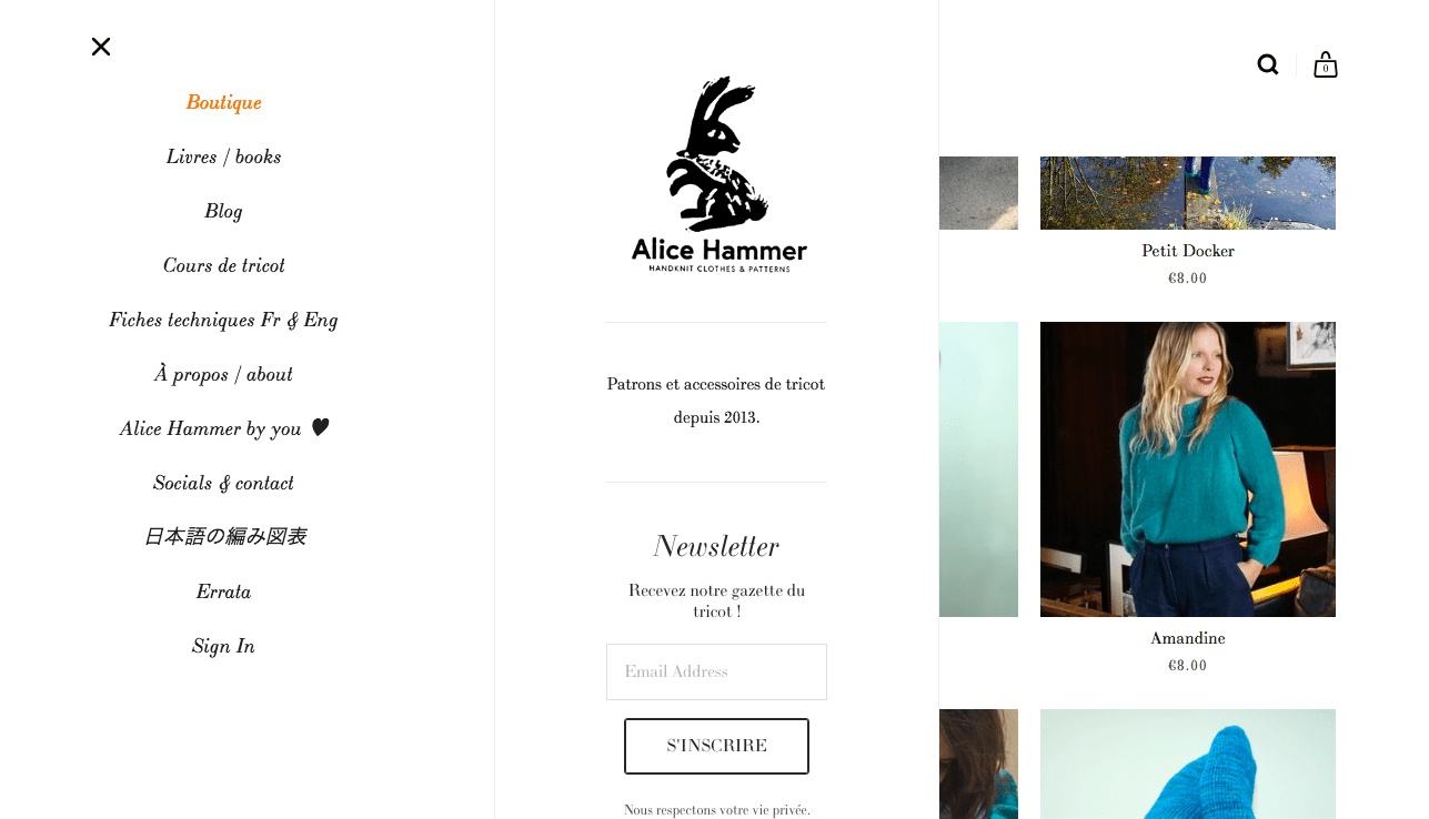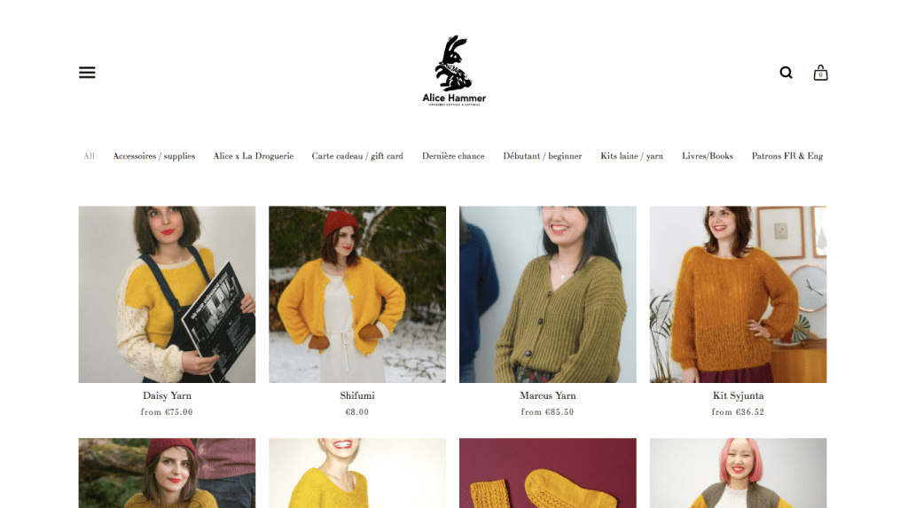 Les catégories de produits sont toujours au rendez-vous avec une nouveauté, l’onglet “débutants” dans lequel j’ai regroupé mes modèles les plus faciles et abordables pour un premier pull ou cardigan.