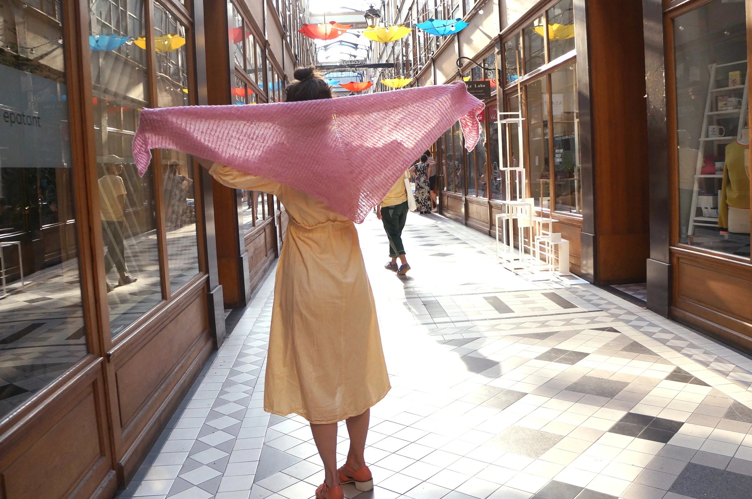 Le fil est très délicat. Comme il est filé à la main, il est irrégulier et c’est ce qui lui donne tout son charme. Je me suis donc lancée dans un design très simple d’une part parce que quand le fil a déjà une identité très forte less is more, mais aussi pour ne pas lui infliger un traitement acrobatique qui risquerait de l’endommager. Puis vous me connaissez – je vais arrêter de dire que j’aime pas les châles puisque j’en ai tricoté quelques uns qui me ravissent ces derniers temps – j’aime les châles simples et j’ai décidé de créer un modèle qui convient aux débutants. C’est un parfait premier châle pour comprendre la construction topdown.