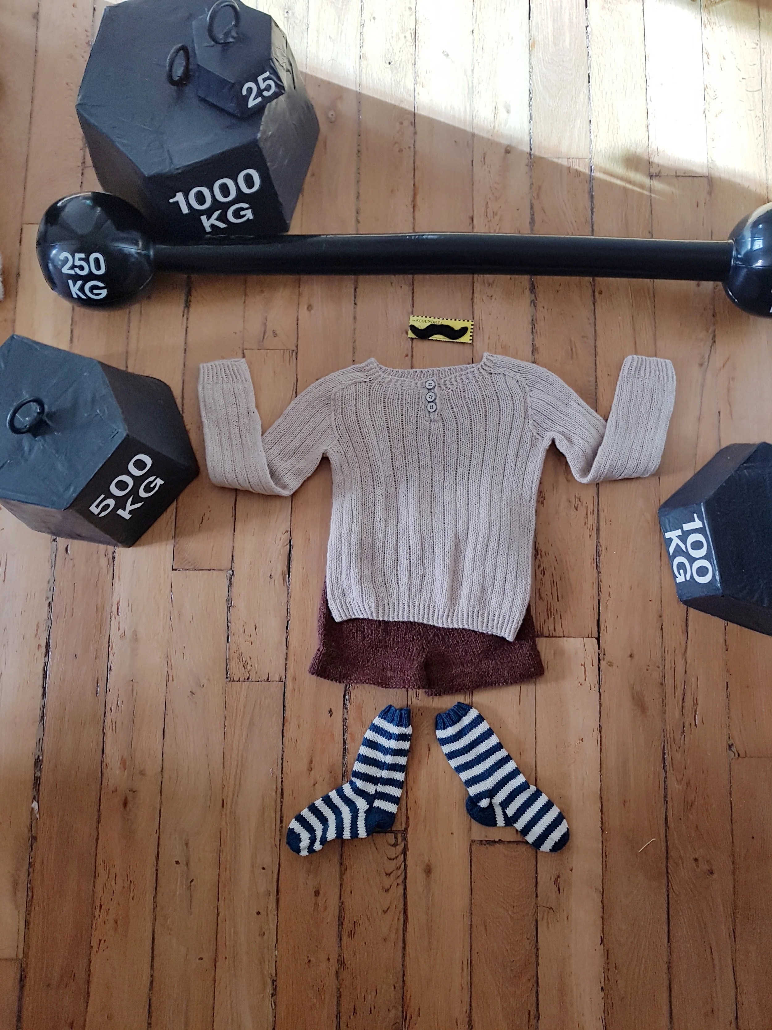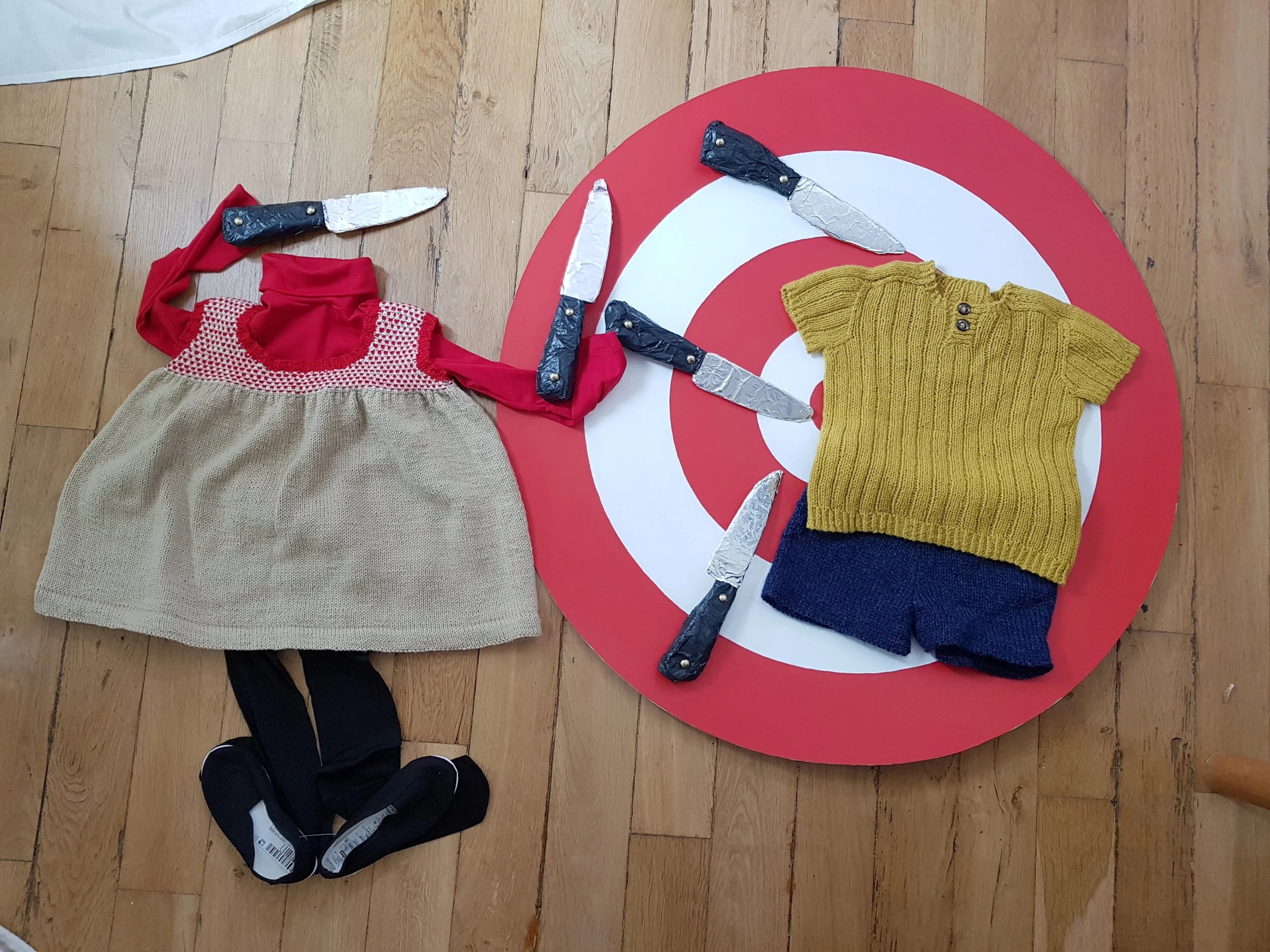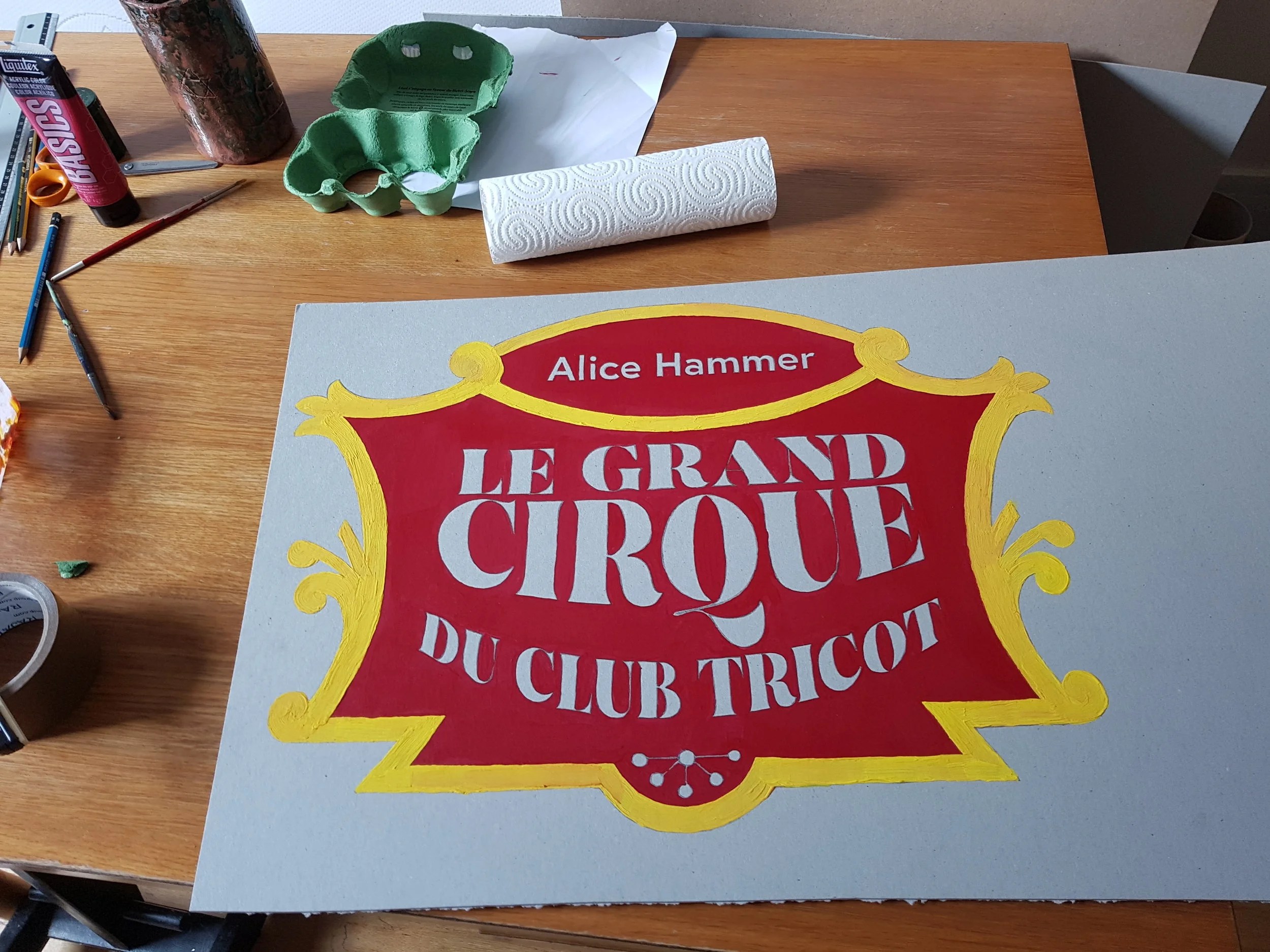 J’ai donc imaginé chaque tricot comme une part de la tenue d’un des personnages du cirque, et j’ai décidé pour les présenter de tirer le portrait à chacun de ces artistes. Comme je me suis lancée dans ce projet plus que fauchée, j’ai pu assouvir ma passion pour la création de décors en papier mâché et j’ai adoré devoir me creuser la tête pour bâtir toute une ambiance à (presque) zéro euros. J’ai bien sûr embarqué Arnaud dans mon aventure et je le remercie car sans lui je n’y serais pas arrivée. Il manie la colle et le papier alu comme personne.