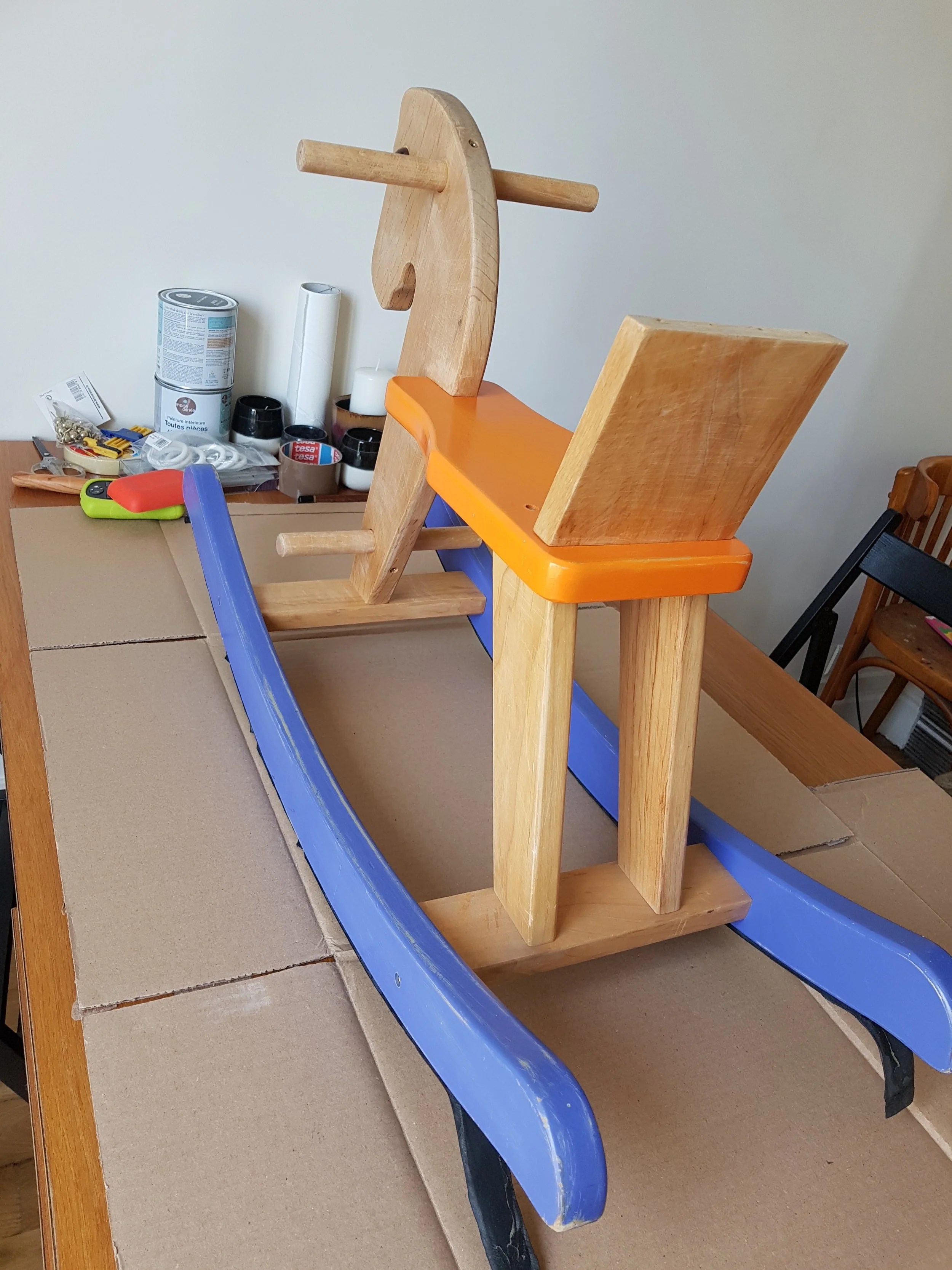 Ensuite il a fallu faire un peu de bricolage… par exemple Bernard l’ancien cheval de Gaby (nom choisi par lui) est devenu grâce à quelques clous, un peu de peinture et un bout de velours trouvé dans la rue Bernardo cheval de cirque.
