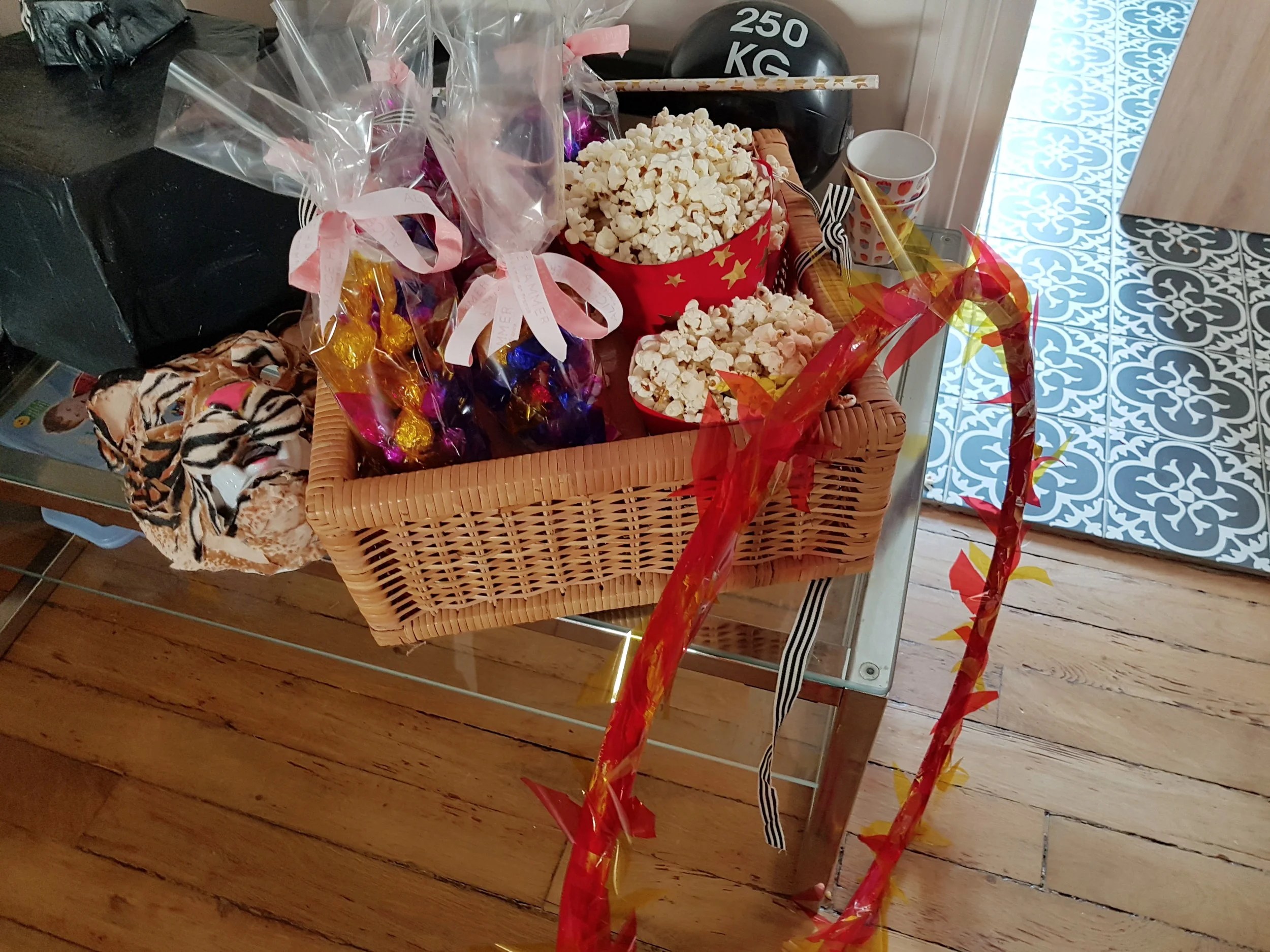 Les derniers préparatifs pour nos scènes, avec la préparation de tonnes de popcorn, de faux bonbons et d’une belle pancarte (la pancarte c’est Arnaud)…