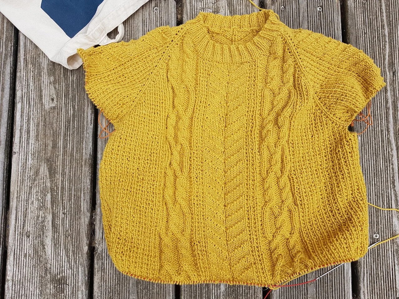 Je viens vous donner des nouvelles de mon tricot jaune. Je vous avais écrit que j’étais partie la semaine passée sur un cardigan pour moi. Arrivée au bout de l’empiècement je me suis rendu compte que ce n’était pas joli, je suis repartie samedi sur un pull pour Arnaud.