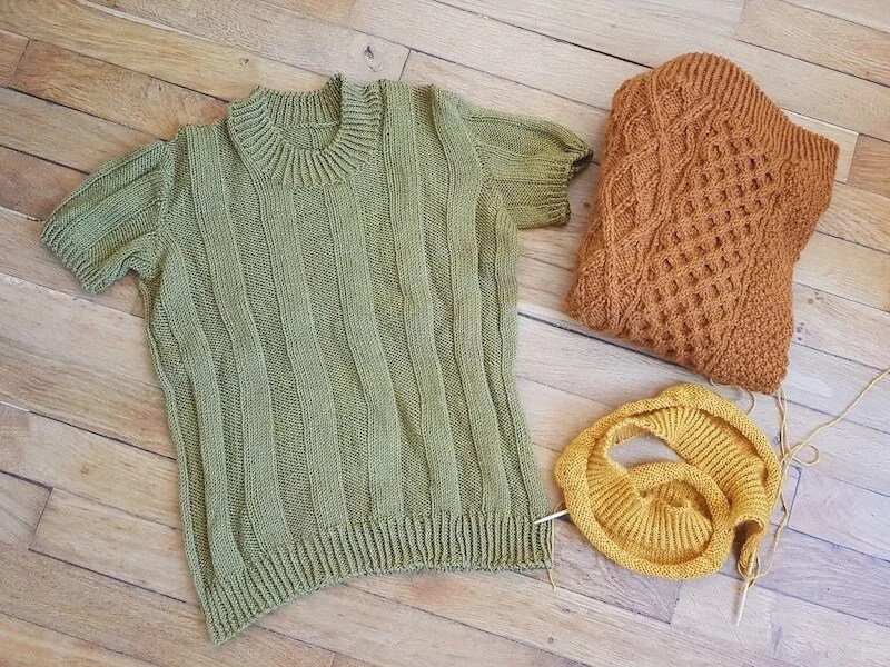 Je ne chôme pas niveau tricot même si je ne suis pas au maximum de mes capacités. Depuis la dernière fois j’ai terminé le t-shirt en Morning Salutation de Kremke (que je n’ai pas encore patronné coucou Caro Fibres Collection) et un truc plein de torsades avec un fil Sandnes Garn (coucou Julie Lili comme Tout) que j’ai découvert pour l’occasion et dont je vous reparlerai. Et je viens de monter un cardigan avec ma laine chérie Caresse de La Droguerie, et ce coloris Ambre Doré me réjouit toujours autant.