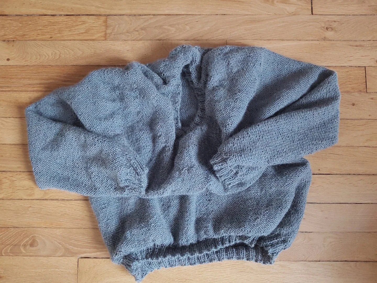 J’ai un peu tricoté mais pas trop, j’ai tout juste terminé un pull en alpaga La Droguerie pour Arnaud, c’était du tout jersey zéro cerveau, pile ce qu’il me fallait rapport à l’état de mon cerveau et rapport à mes futurs tricots qui vont me demander 2 ou 3 neurones valides.