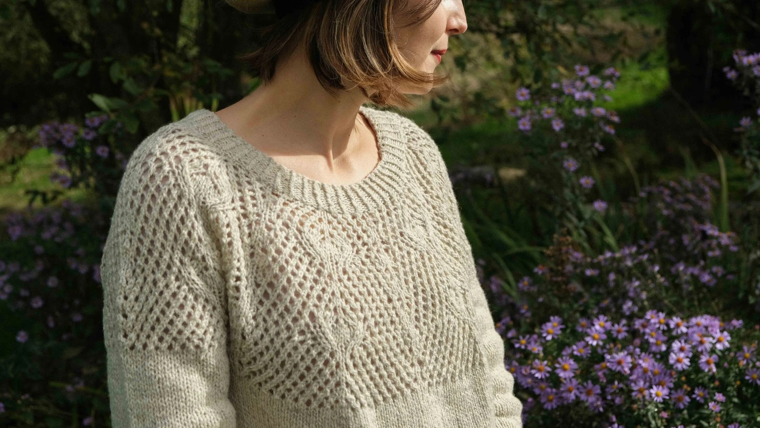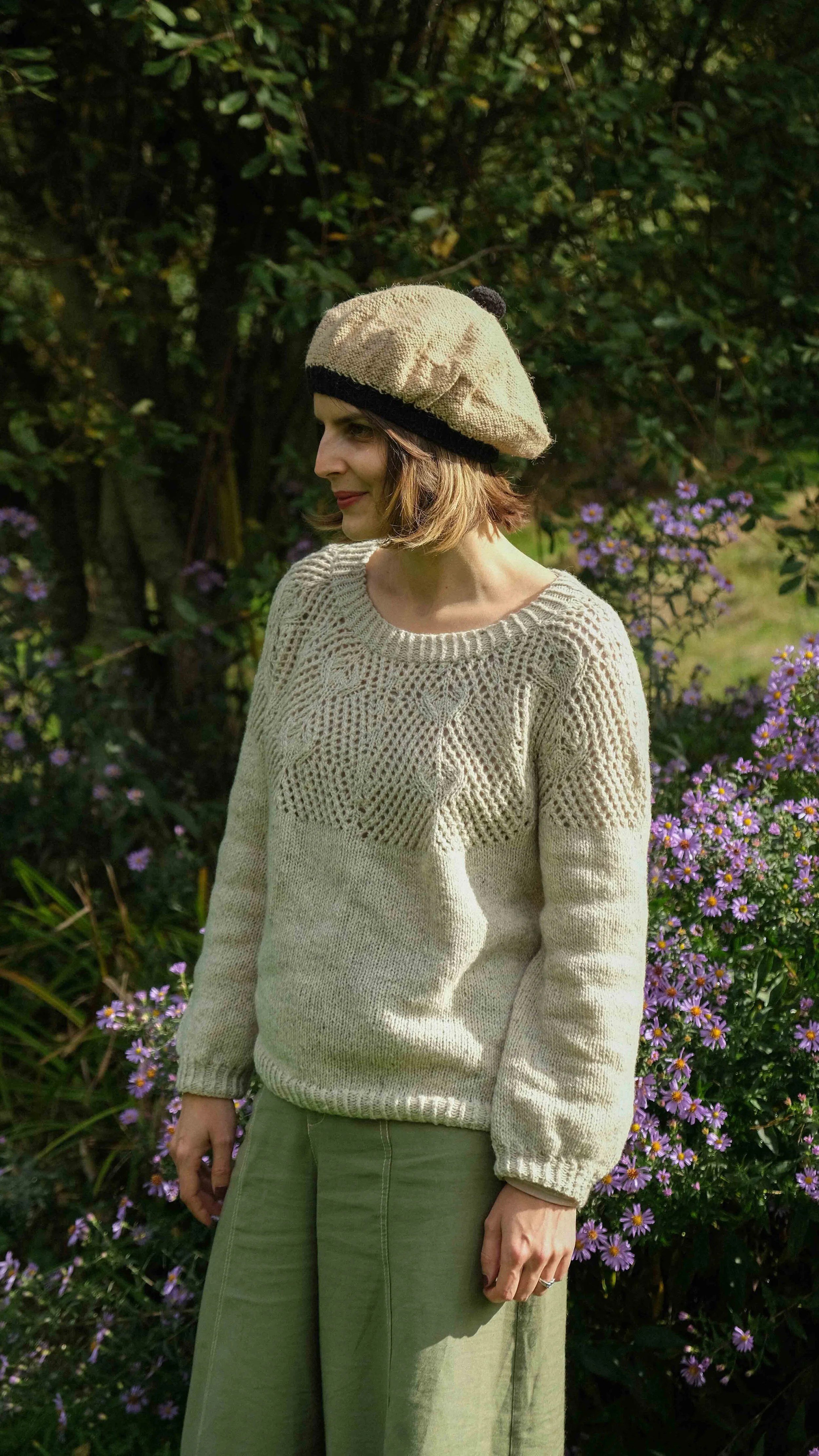 J’ai pour l’occasion découvert un fil BcGarn que j’ai beaucoup : il est léger, son aspect est assez rustique mais au toucher il est extrêmement doux. Si vous souhaitez tricoter le pull avec un autre fil, attention, utilisez un fil léger pour ne pas que le bas du pull pèse et vienne étirer la dentelle.
