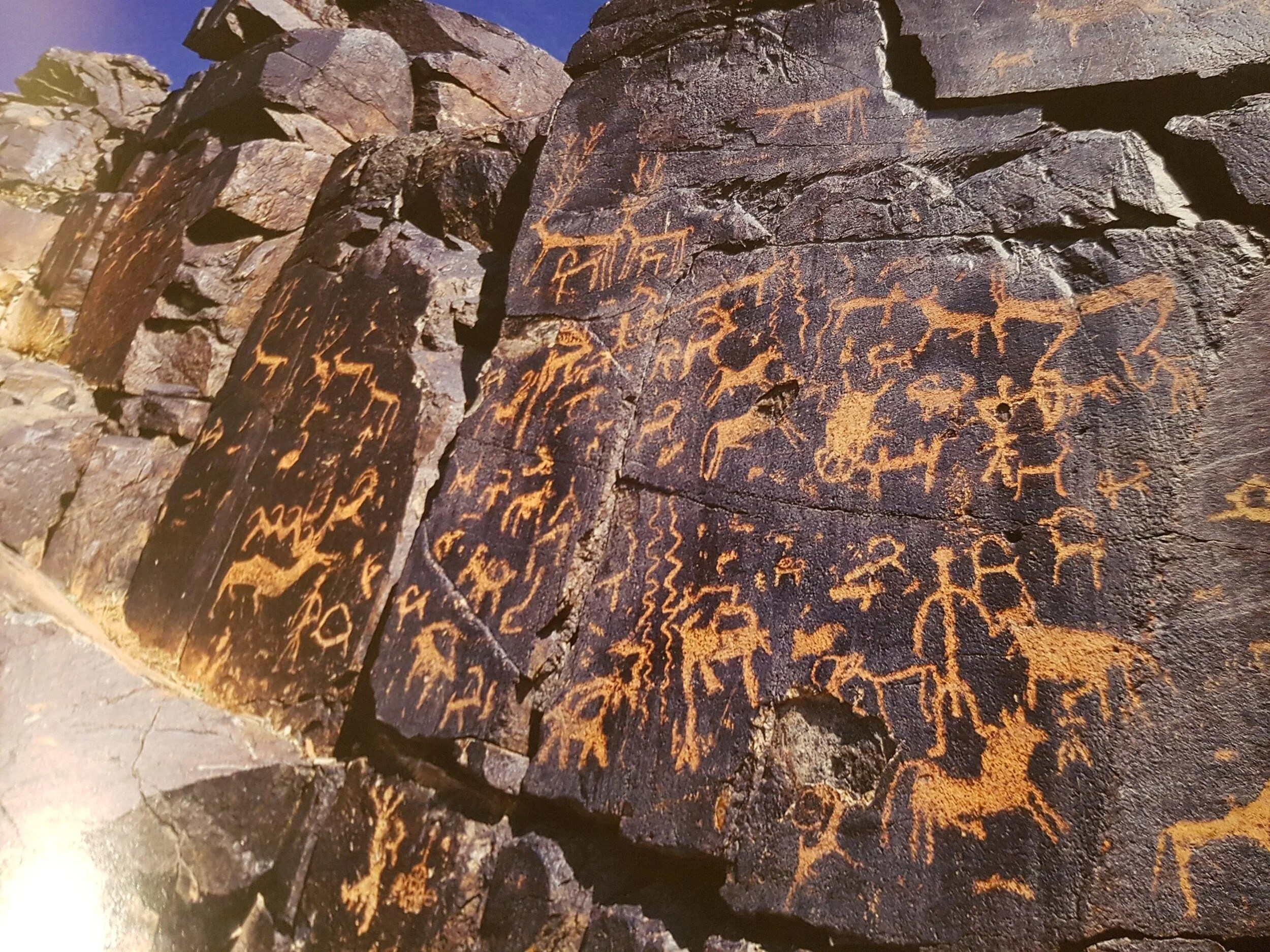 Il s’agit d’un pétroglyphe en Mongolie dans le désert de Gobi ! Il s’agit précisément pétroglyphe de Bayanlig. Il nous intéresse car il date d’à peu près 3000 ans avant J.-C. et représente 2 animaux : de grandes chèvres, aussi grandes que les chasseurs, qui sont des chèvres sauvages mais aussi de petites chèvres à cornes, qui témoignent des origines de l’élevage caprin. On pense que cette oeuvre représente une scène d’élevage, avec un homme au milieu de petites chèvres domestiquées qui seraient donc de petites chèves cachemire ! Le site est encore connu pour la qualité particulière du cachemire donné par les chèvres, il y est plus fin et plus blanc qu’ailleurs.