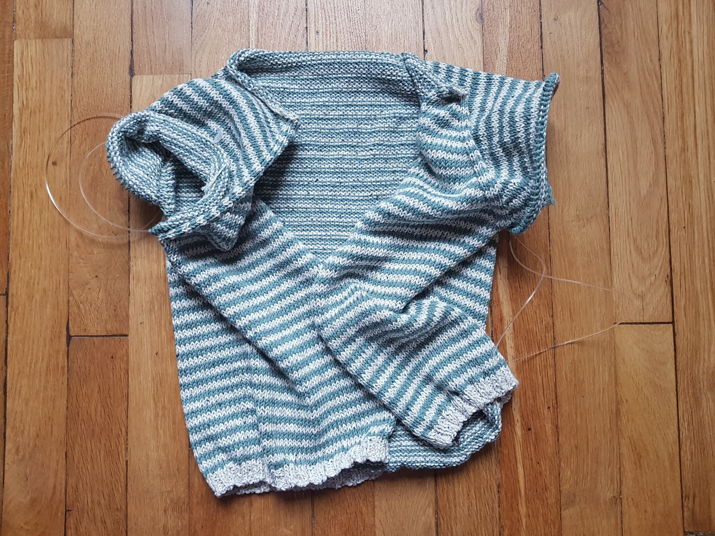 Cette semaine j’ai avancé sur mon haut d’été en coton (il ne me reste plus que la boutonnière et les manches courtes), et j’ai presque terminé les finitions de mon jacquard; il me reste 3cm de bordure I-Cord à faire ce soir.