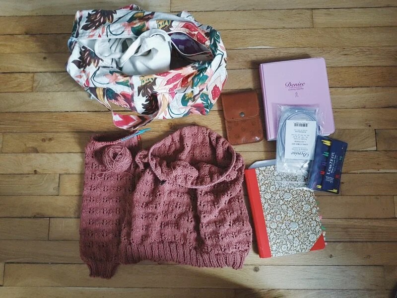 Mon encours bien-sûr, avec mon cahier pour prendre des notes et faire des calculs, et tous les kits d’aiguilles qui vont avec celles que j’utilise sur ce projet : mes aiguilles détestent voyager loin de leur kit complet alors je suis obligée de prendre toute la gamme à chaque fois. Elles n’aiment pas tellement voyager sans tous les autres kits, mais on fait une exception pour cette fois.