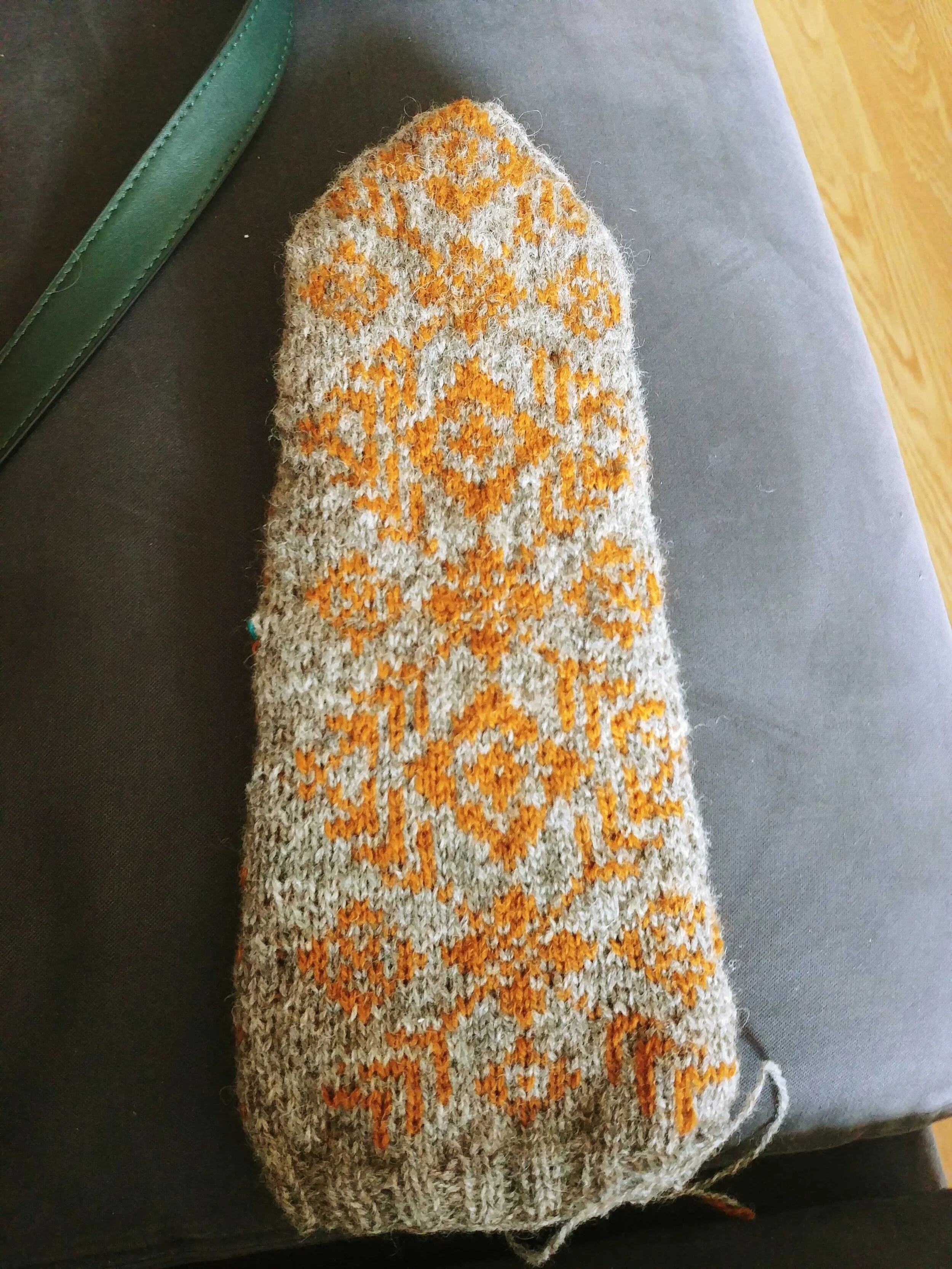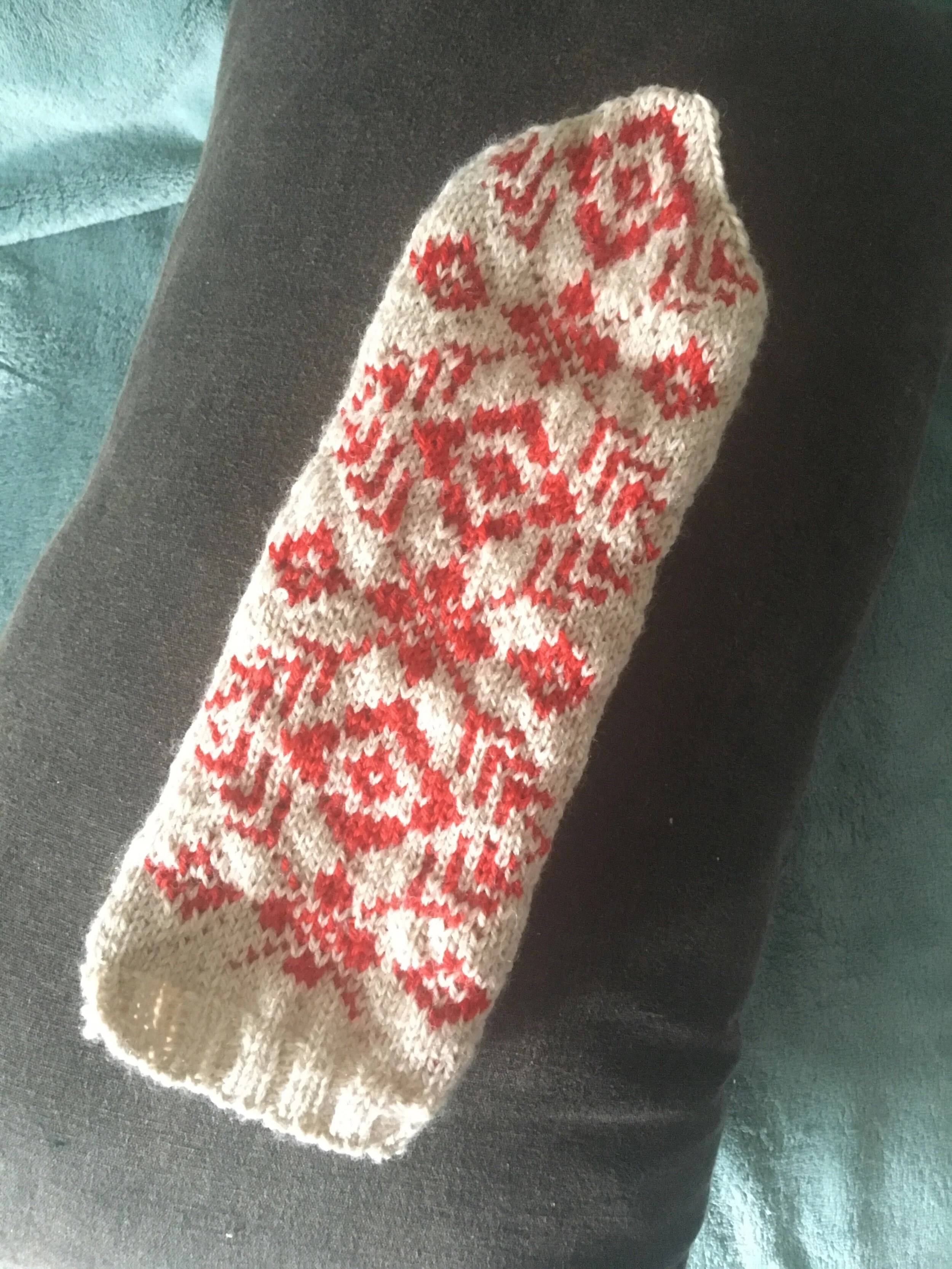 Les moufles ont un motif assorti sur le dessus, et un motif plus petit et répétitif à l’intérieur des mains. L’ensemble se décline en 2 tailles. C’était pour moi une évidence de proposer un modèle en jacquard avec ce fil là : il est très léger, très très chaud, assez fin mais très gonflant après avoir trempé un peu, et les fils s’accrochent bien entre eux sur l’envers du travail. C’est un fil composé à 50% toisons provenant de l’île d’Ouessant, de 25% moutons élevés en Finistère (dont une partie en élevage bio) et de 25% mérinos d’Arles élevés en France. C’est un très beau mélange que nous ont concocté Brigitte et Clotilde de Bouclelaine, qui met en valeur la caractéristique la qualité de chaque fibre, et le choix énorme de couleurs en fera le meilleur ami des jacquardeurs.