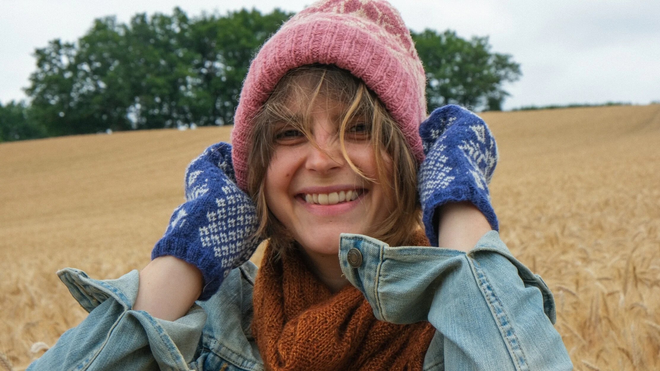 Olivette c’est très simple, c’est l’ensemble qui fait la couverture du livre ! On a choisi cette photo pour l’ambiance colorée, mais aussi car je renifle mes moufles qui sentent bon le poil de bête, tout amoureux de la laine qui sent se reconnaitra ! Pour ma part c’est un des premiers réflexes que j’ai quand une pelote me tombe entre les mains : je la renifle. Avec Olivette, on reste chez Bouclelaine mais cette fois-ci avec le fil Ouessant 50, un fil très particulier qui se décline en une quarantaine de coloris.