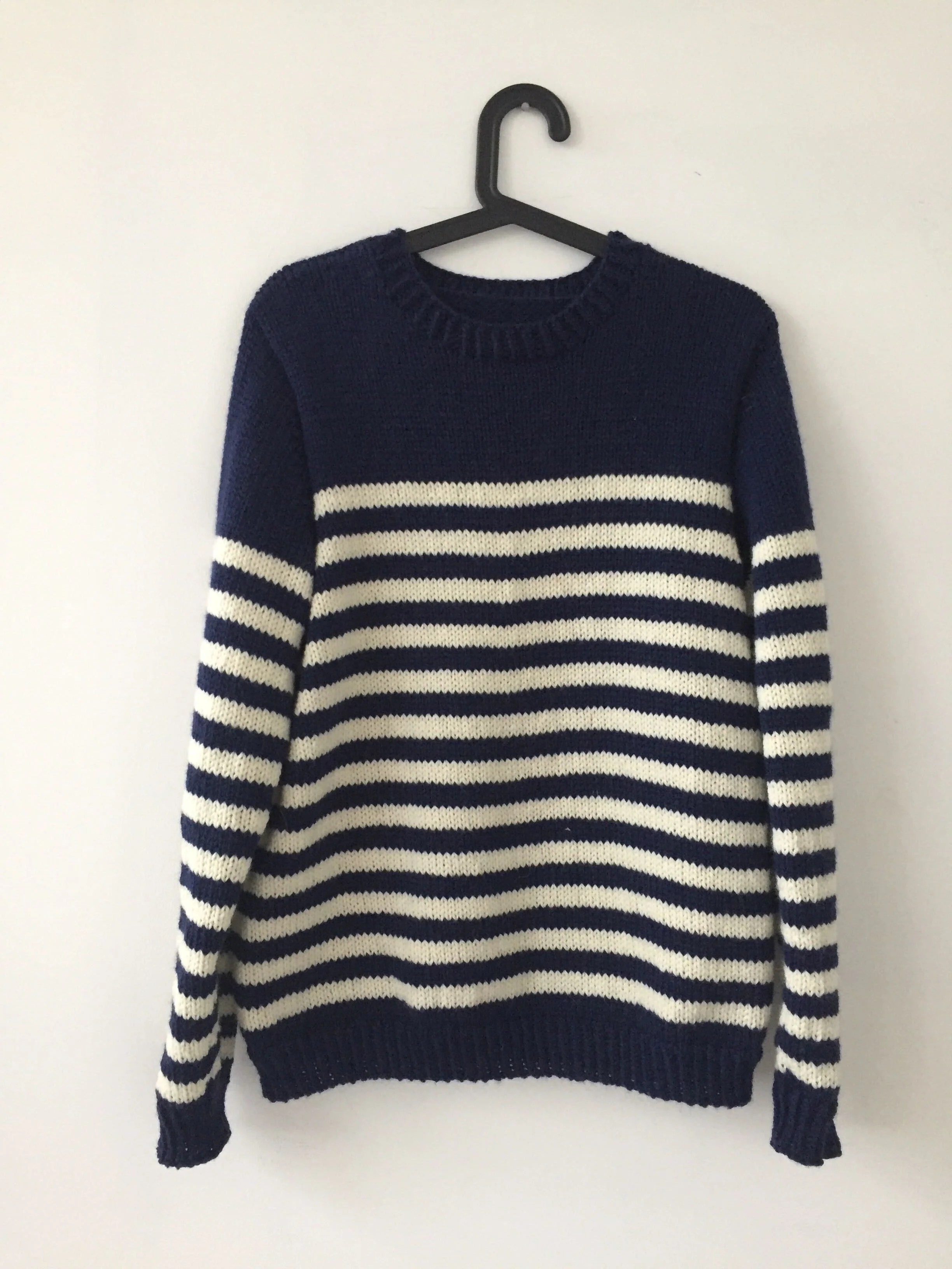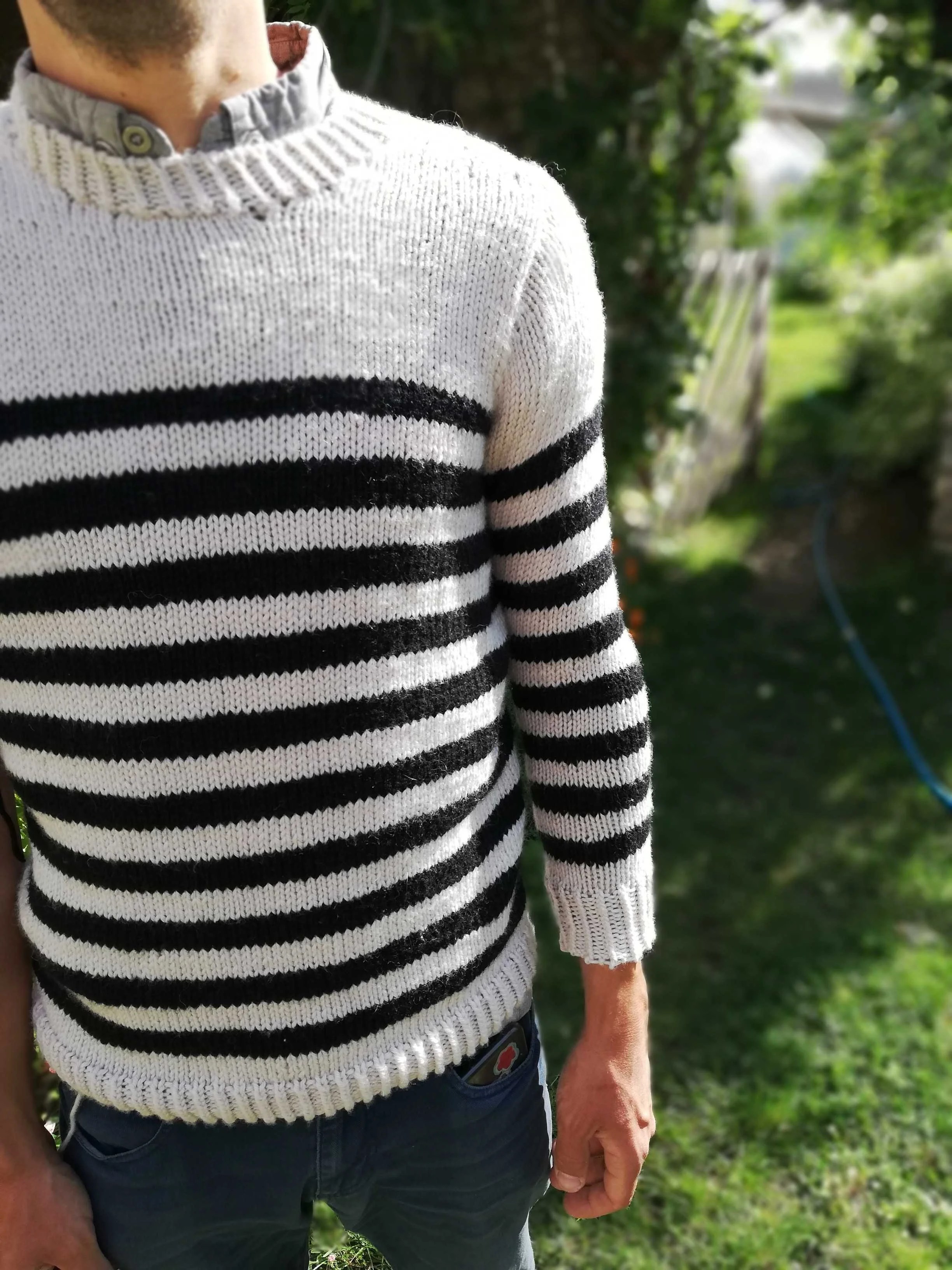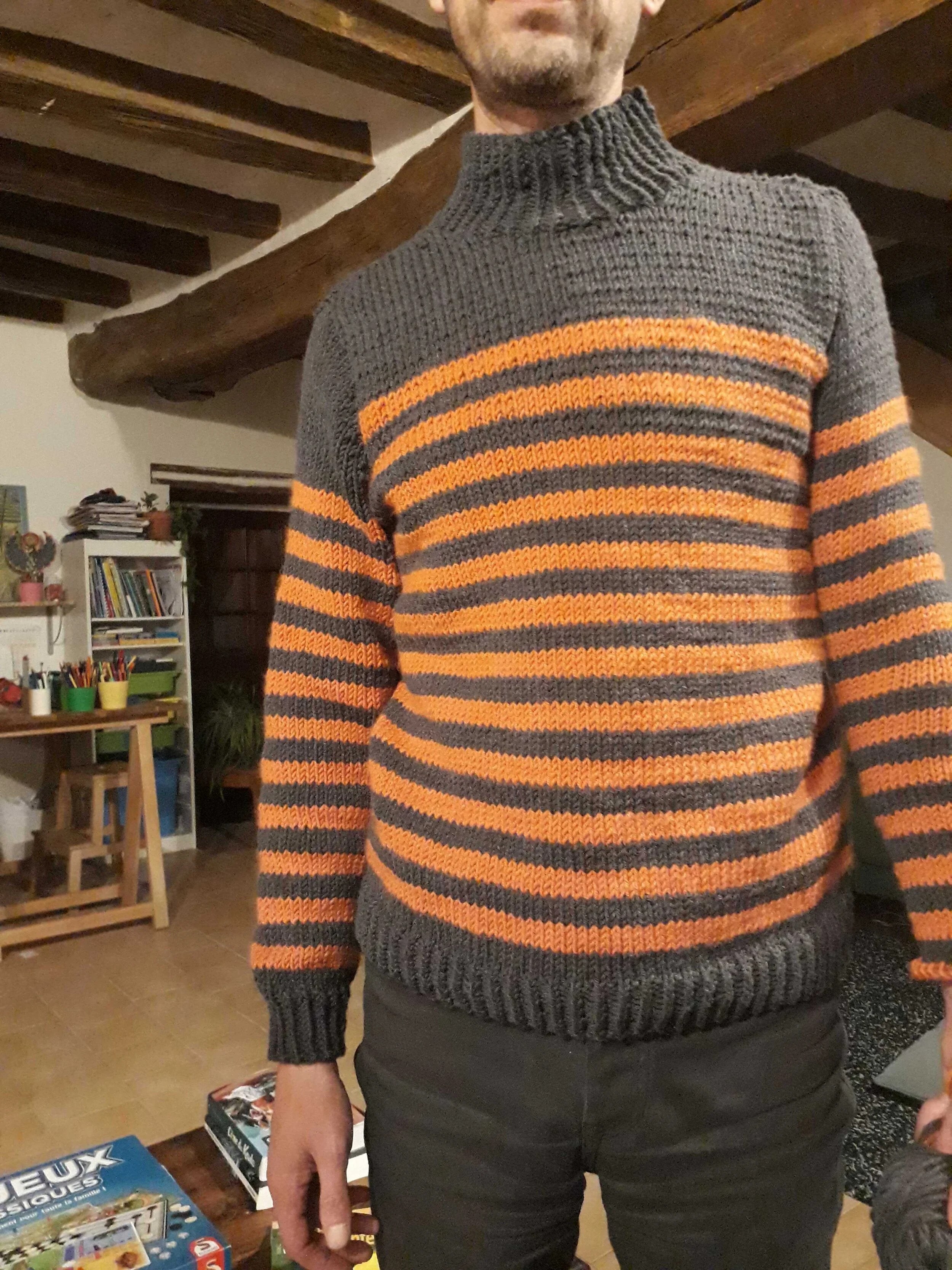 J’ai tricoté à Arnaud (mais le modèle est parfaitement mixte) cette marinière avec un autre fil que j’apprécie beaucoup et que j’ai déjà utilisé dans un certain nombre de patrons, la Nouvelle Benjamine. Pourquoi j’aime ce fil ? la réponse est un peu idiote, c’est parce qu’il fait de grosses mailles régulières et bien dessinées. Arnaud dessine souvent des pulls avec des grosses mailles, et je trouve que quand je tricote ce fil ça ressemble à ses dessins. Ça faisait longtemps que j’avais envie de tricoter une marnière avec, justement parce que j’aime bien le fait que sur le bord de la rayure on distingue bien le petit “V” de la maille. L’inspiration tient souvent à peu de choses ! Ce modèle m’a aussi permis de tricoter un autre basique pour le livre, je trouve qu’on n’a jamais assez de marinières. Je ne dirais pas que c’est un modèle, malgré sa simplicité, pour les grands débutants : on tricote de bas en haut, puis on relève des mailles autour des emmanchures et on travaille la tête d’épaule avec quelques rangs-raccourcis. Rien de très compliqué toutefois.