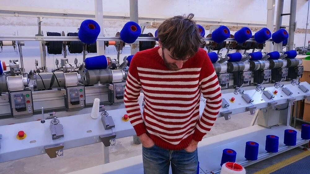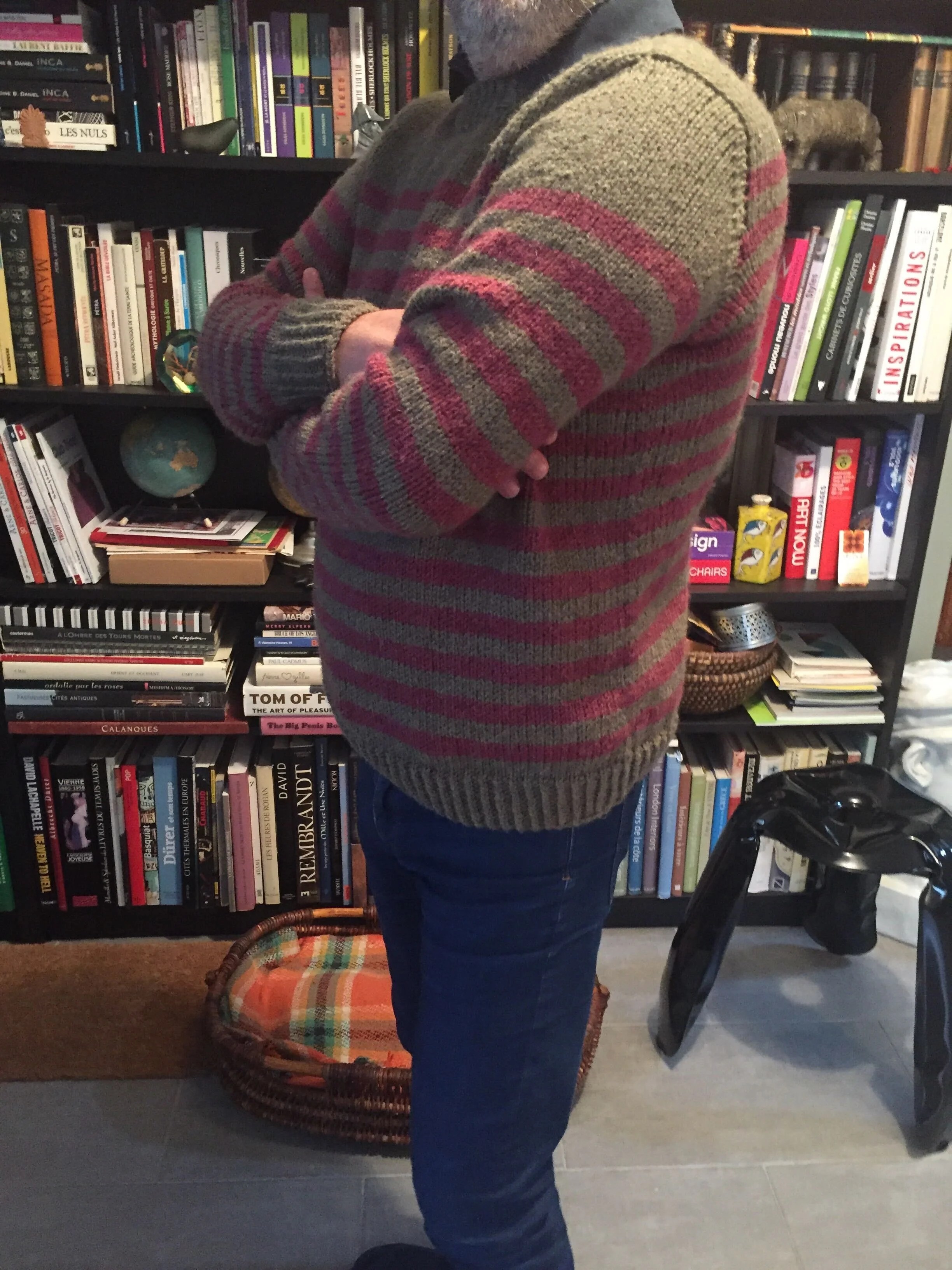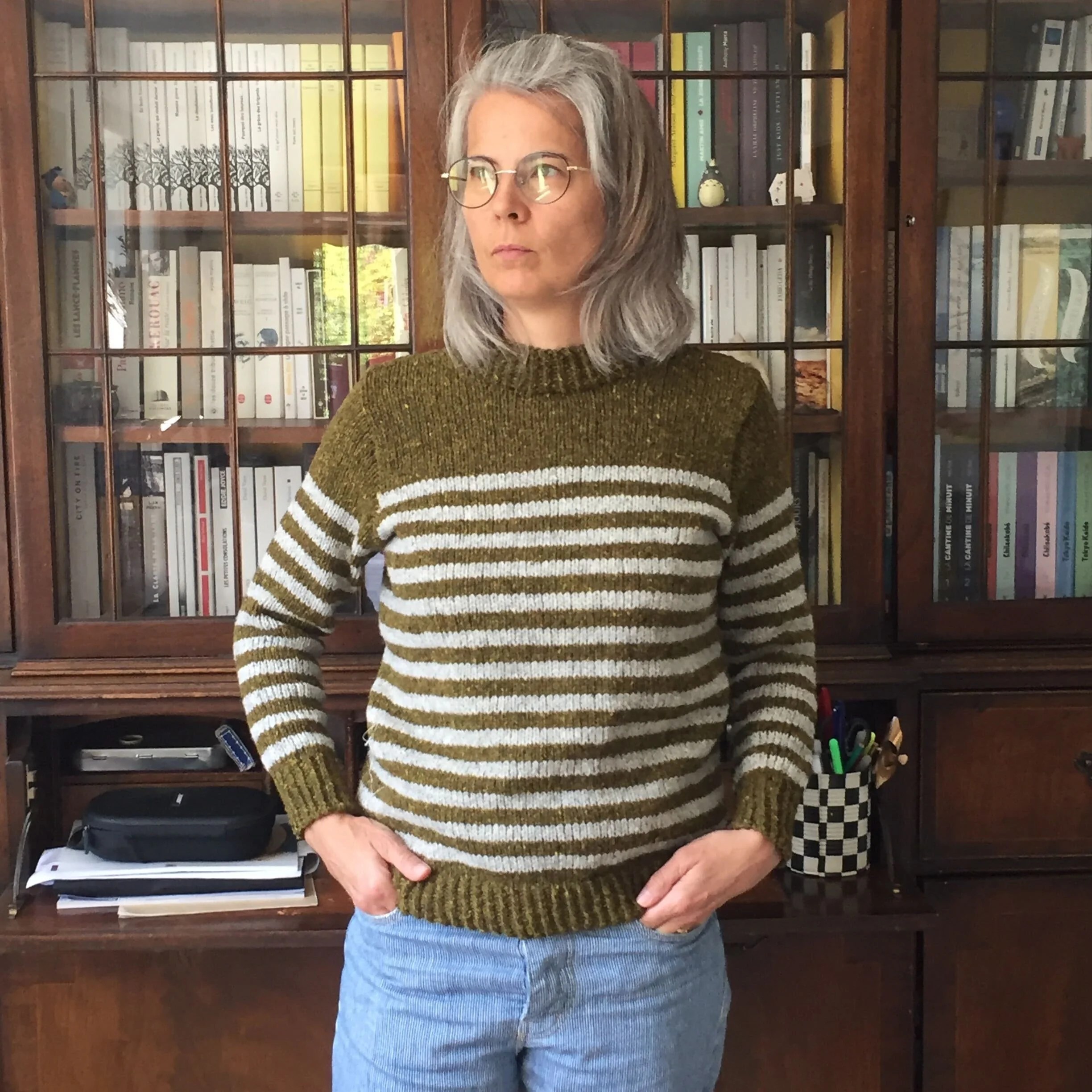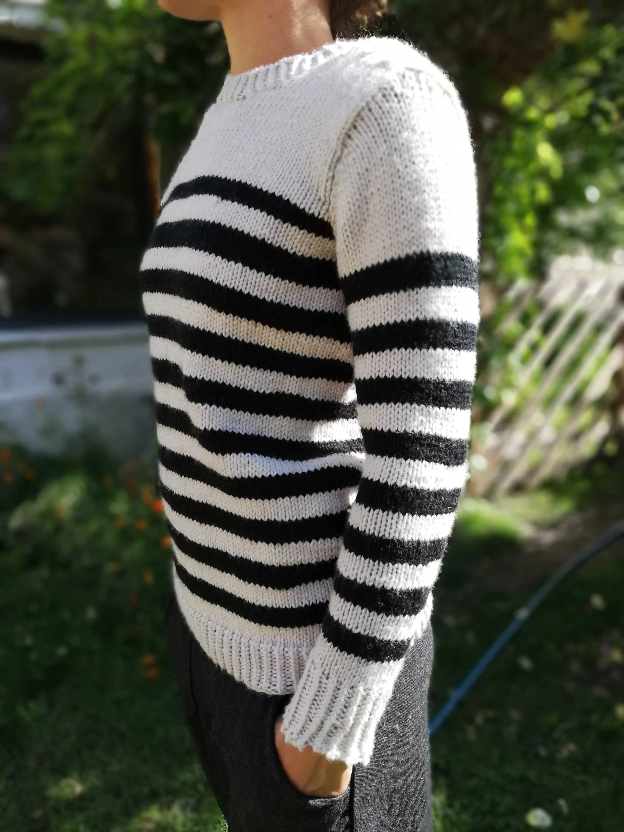 J’ai tricoté à Arnaud (mais le modèle est parfaitement mixte) cette marinière avec un autre fil que j’apprécie beaucoup et que j’ai déjà utilisé dans un certain nombre de patrons, la Nouvelle Benjamine. Pourquoi j’aime ce fil ? la réponse est un peu idiote, c’est parce qu’il fait de grosses mailles régulières et bien dessinées. Arnaud dessine souvent des pulls avec des grosses mailles, et je trouve que quand je tricote ce fil ça ressemble à ses dessins. Ça faisait longtemps que j’avais envie de tricoter une marnière avec, justement parce que j’aime bien le fait que sur le bord de la rayure on distingue bien le petit “V” de la maille. L’inspiration tient souvent à peu de choses ! Ce modèle m’a aussi permis de tricoter un autre basique pour le livre, je trouve qu’on n’a jamais assez de marinières. Je ne dirais pas que c’est un modèle, malgré sa simplicité, pour les grands débutants : on tricote de bas en haut, puis on relève des mailles autour des emmanchures et on travaille la tête d’épaule avec quelques rangs-raccourcis. Rien de très compliqué toutefois.