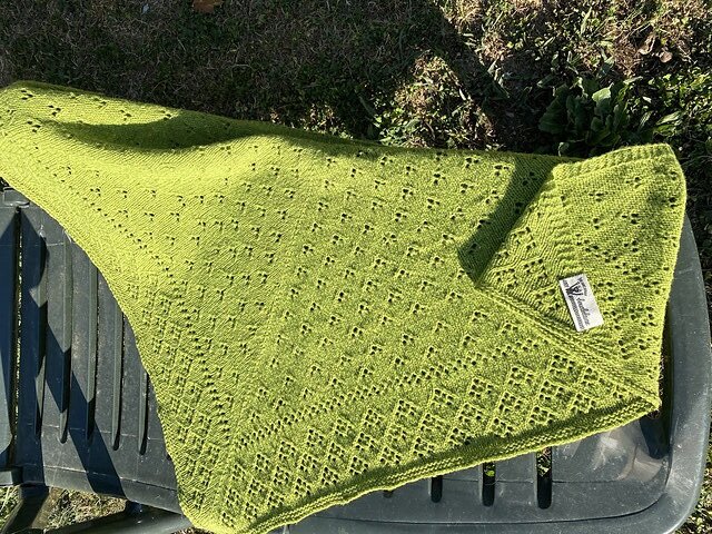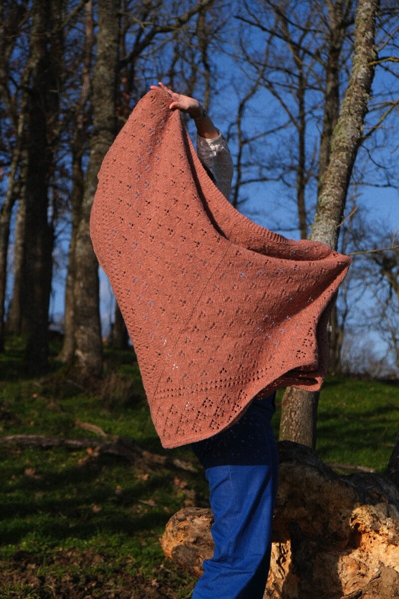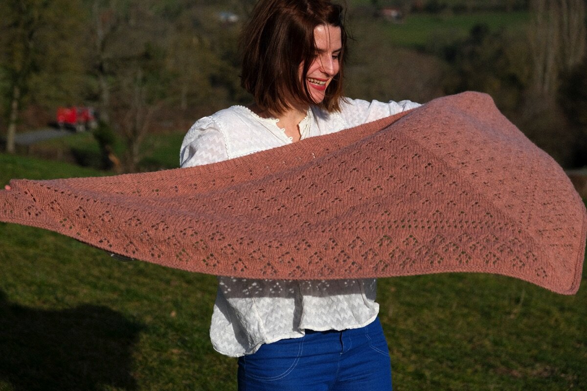 C’est un châle qui se tricote en topdown, j’ai tenté un montage un peu spécial : on commence par un montage à la Turque, comme pour les pointes de chaussettes, mais ensuite on tricote ce montage à plat en allers-retours. J’ai fait un pas à pas photo dans le patron. Ensuite c’est un châle classique, on augmente de 4 mailles (une à chaque bout et 2 autour d’une maille centrale) tous les 2 rangs, en répétant un petit motif dentelle facile à retenir.