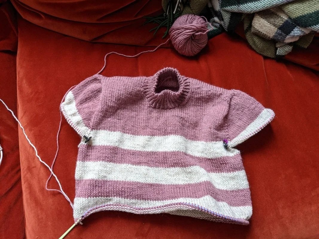 Voici le tricot d’aéroport, tricoté avec le fil Nimbus (toujours de Fonty) que je découvre et que j’apprécie beaucoup, ça grimpe tout seul ! Je suis aussi embarquée dans le flux de la rayure, je ne sais pas si ça vous fait ça mais j’ai du mal à m’arrêter avant la fin de la rayure, puis finalement la fin de la prochaine etc. J’ai utilisé la même construction que j’avais utilisée pour le cardigan Hockney dans Club Tricot 1, à savoir un montage provisoire pour les épaules et ensuite un empiècement qui se tricote tout en rond. Je lui fais des épaules bouffantes, j’espère que ça vous plaira. C’est en tous cas un tricot parfaitement adapté à nos soirées tricot entre abonnées au cours desquelles j’ai tendance à me planter quand je fais des motifs…