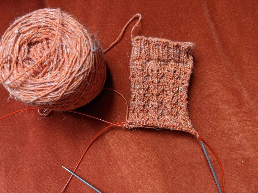 Et enfin la chaussette, avec un fil qu’il me tardait d’essayer. Il s’agit du Lazy Linen de Kremke, un fil à chaussettes dans lequel le pourcentage de nylon nécessaire à la solidité de l’ouvrage a été remplacé par du lin. J’avais déjà monté une chaussette avec mais n’étais pas convaincue par ce que j’avais fait, j’avais détricoté. Après ce faux départ j’appréhendais un peu car la texture du fil est assez spéciale : on voit des petites fibres de lin froufrouter autour du fil, mais ça y est je suis très contente et tout roule.