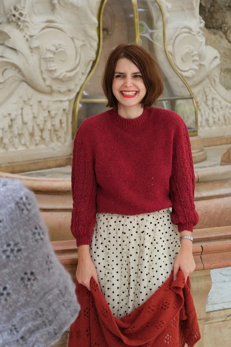 Quant à moi je porte la taille S en Rouge Hermes tricoté par Camille