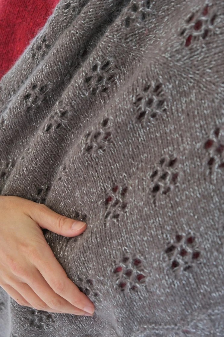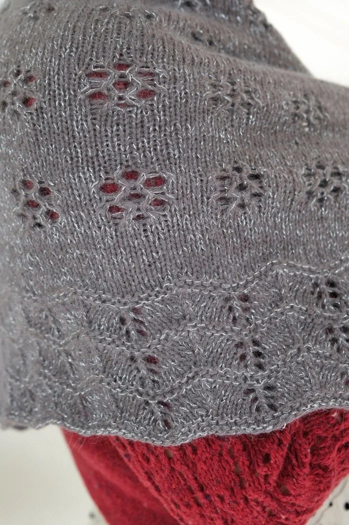 La première partie est composée d’un semis de fleurs ajourées inspirées du tricot dentelle estonien. La grande bordure en chevron est obtenue par un jeu très simple de jetés et de diminutions.