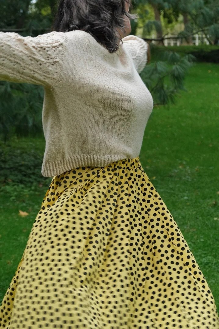 Annouchka porte le Michka que j’ai tricoté en coloris beige, taille XL pour un tombé « loose ».