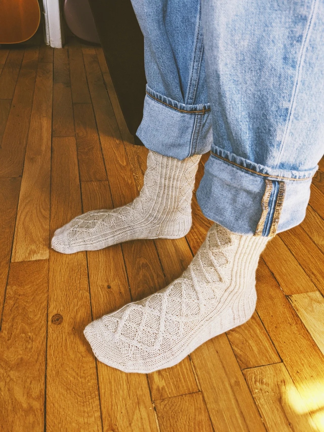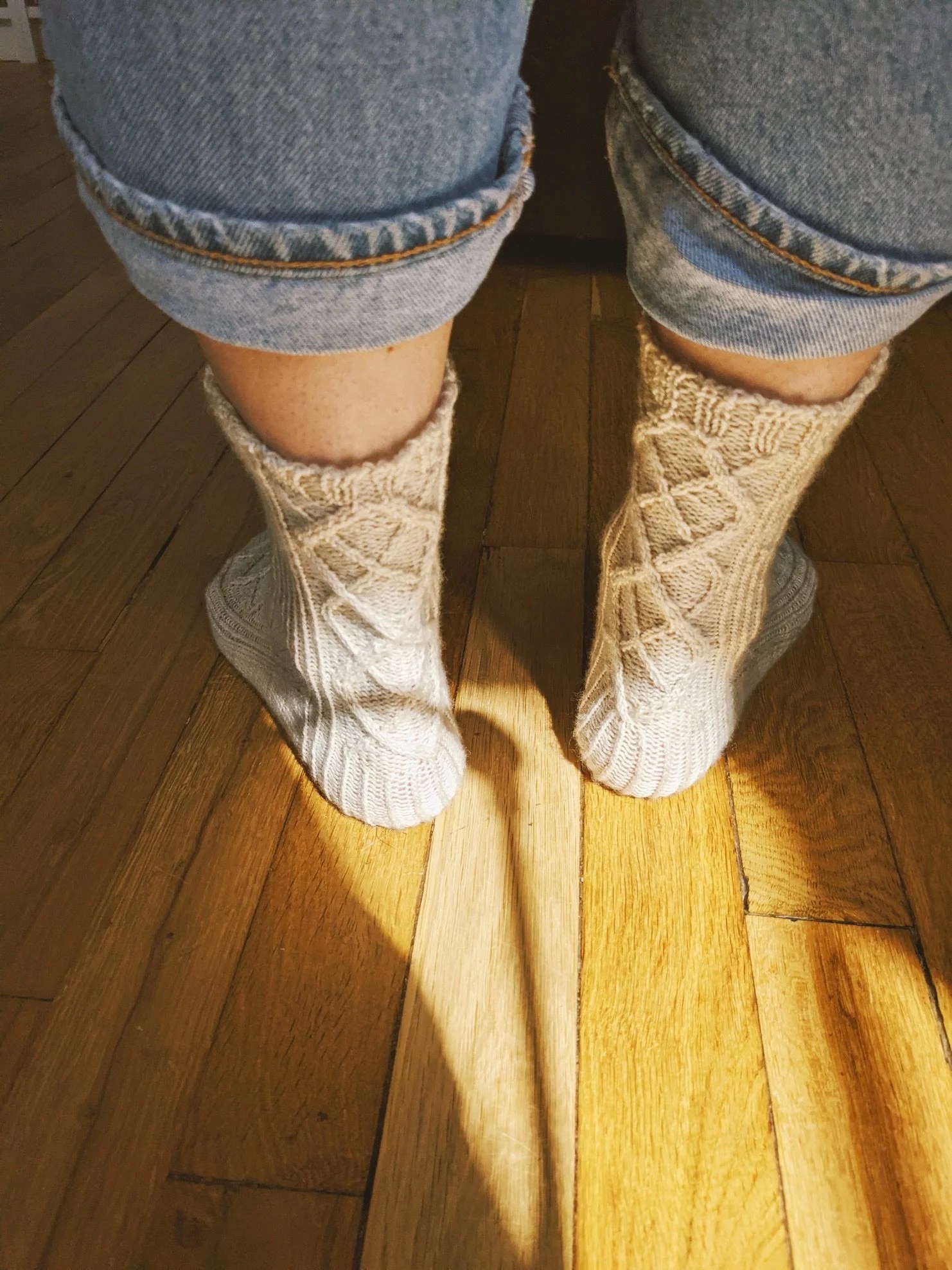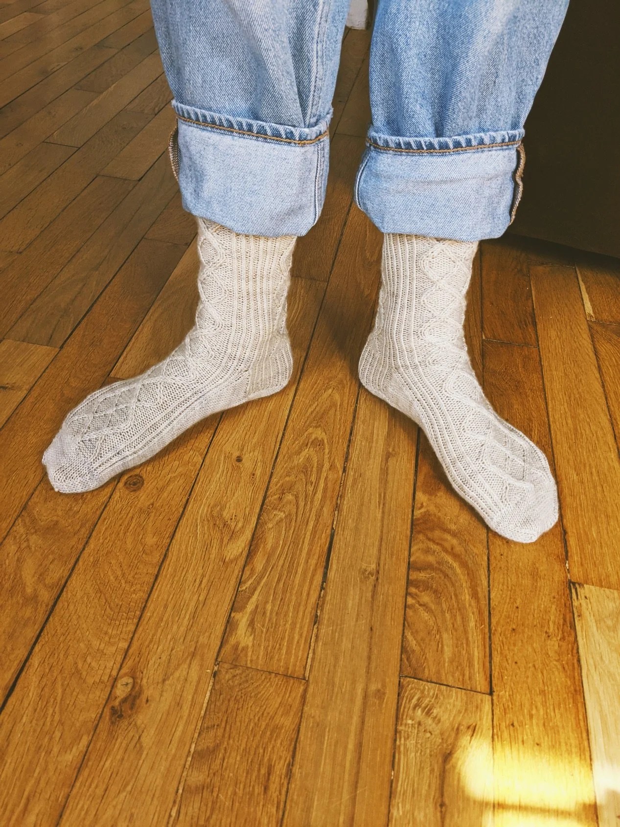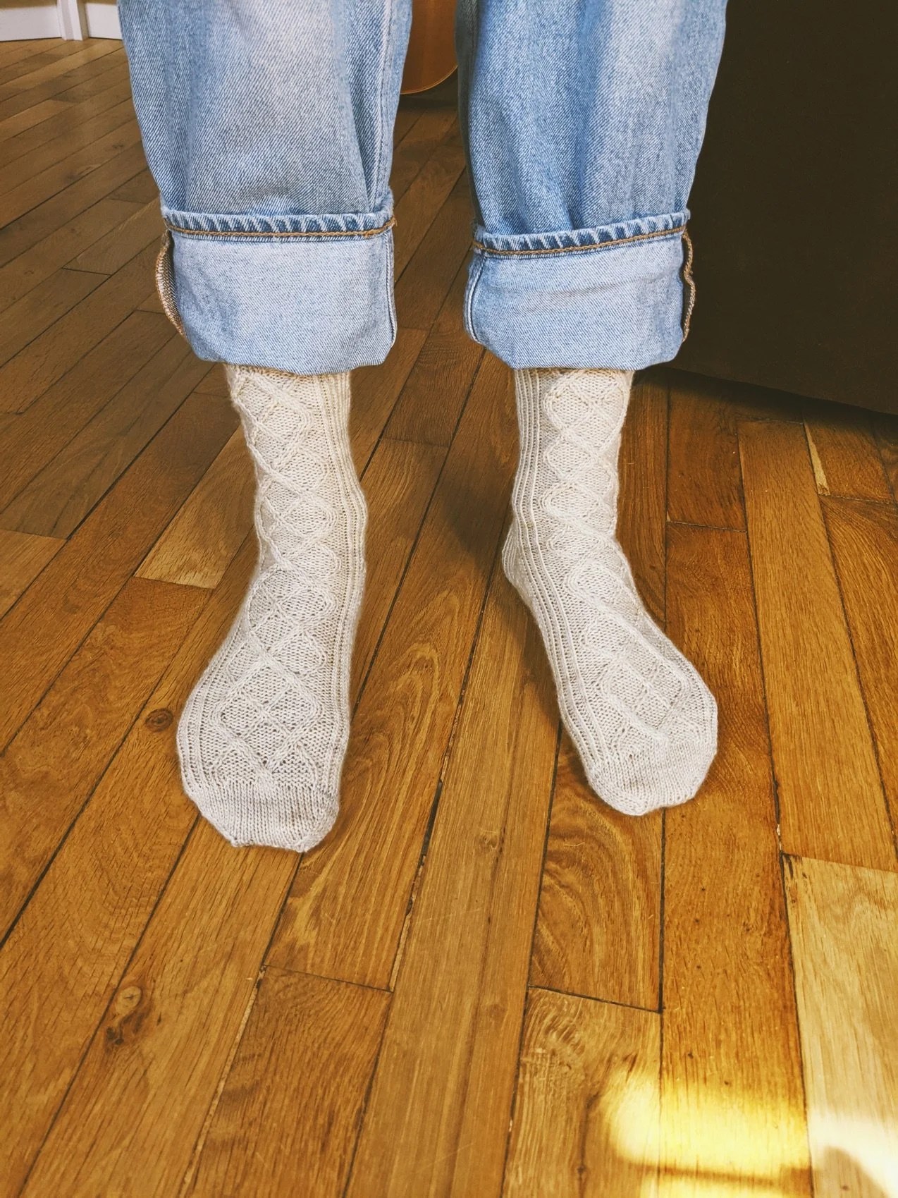 Il s’agissait des chaussettes Anri ! Elles se tricotent de la cheville à la pointe, et les talons sont à gousset et le patron est disponible de la taille 36 à la taille 47 fillette. Je les ai tricotées avec le fil Mérino super sock de La bien Aimée.