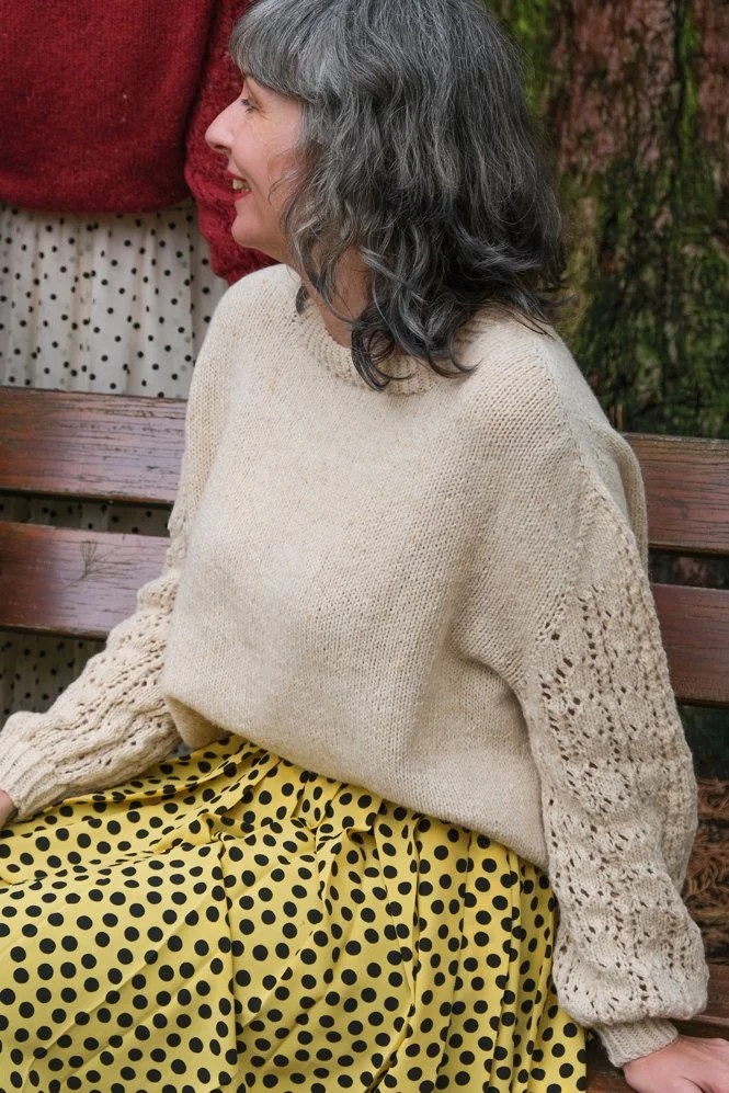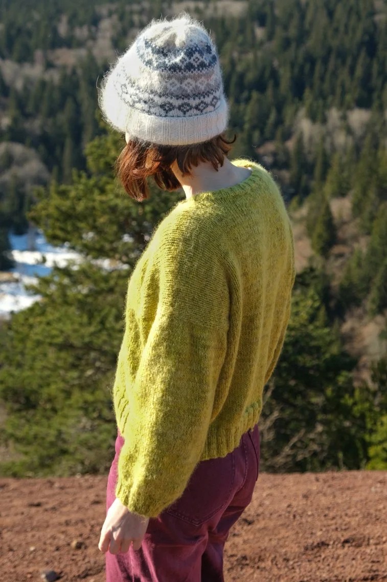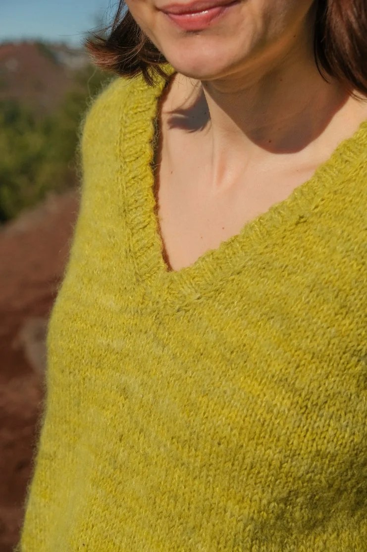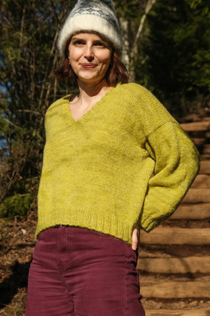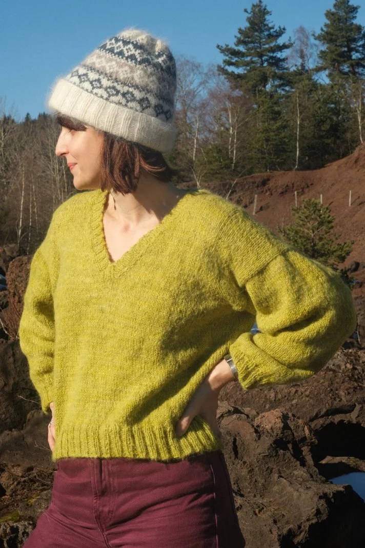 J’ai choisi ce vert que j’adore “t’as une tâche pistache” chez Cécile La Fée Fil juste avant le premier confinement, c’est une couleur plutôt présente alors je me suis tricoté un pull tout simple mais pas barbant ! On le commence par les épaules avec un montage provisoire au crochet, puis il est tout tricoté en top-down. J’ai utilisé un fil de mérinos et un fil de suri/soie tricotés ensemble, mais ça fonctionne aussi avec un mélange mérinos + mohair/soie, Cécile vous a préparé des kits sur son site !