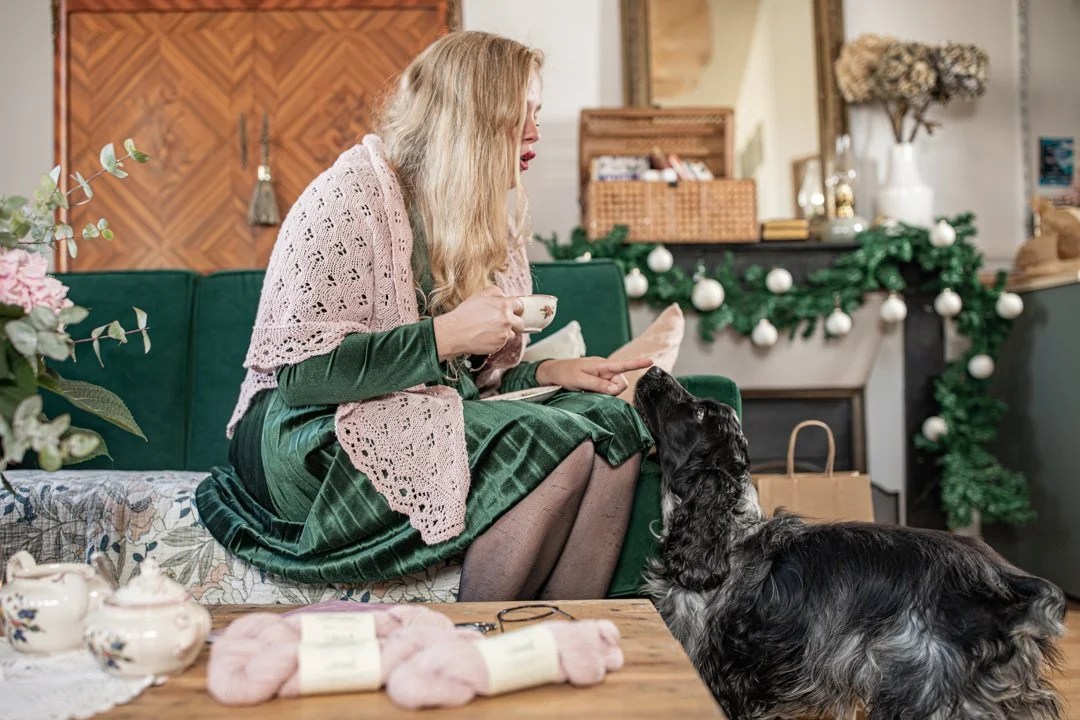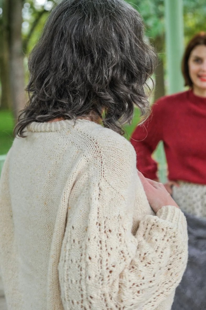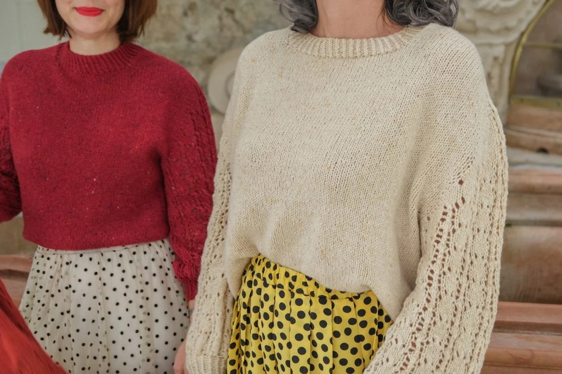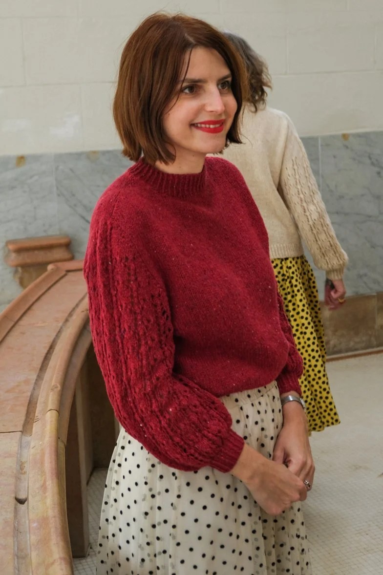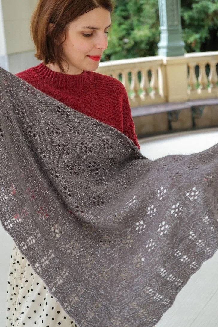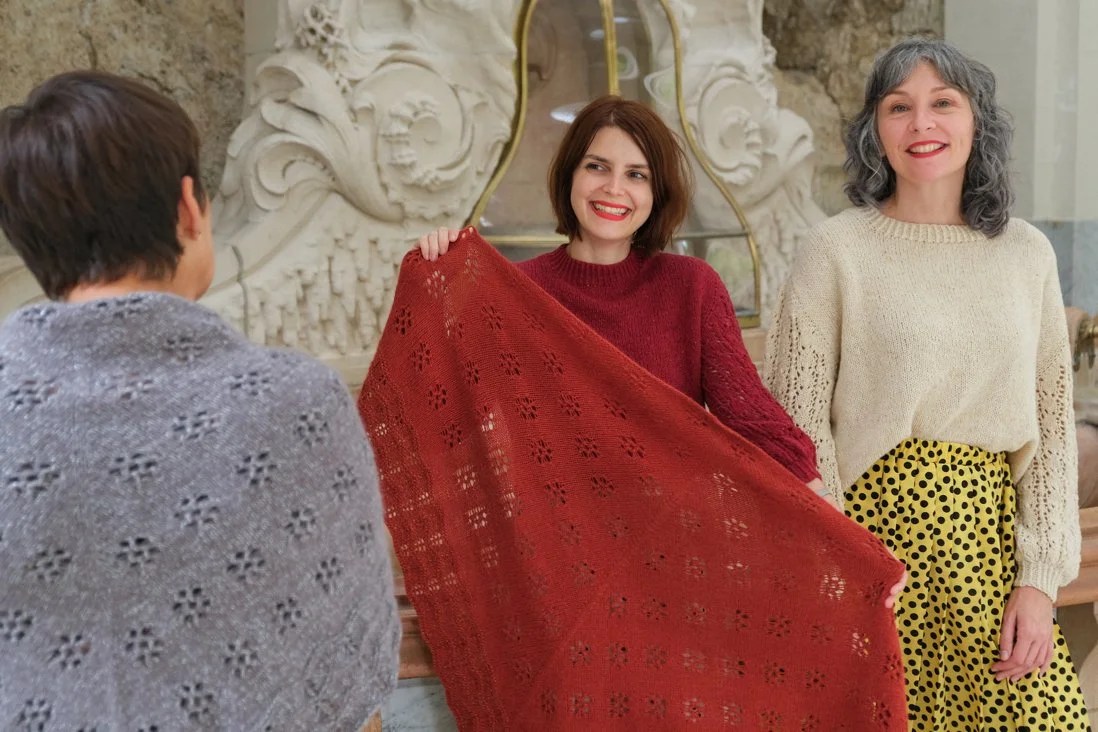 Nadesja se tricote en top-down. On augmente de 4 mailles tous les 2 rangs tout en intégrant un motif floral ajouré inspiré de la dentelle estonienne. La bordure à l’effet zig-zag est travaillée grâce à un jeu de diminutions et de jetés. J’ai utilisé un autre de mes fils préférés, le Duvet d’Anjou de La Droguerie et j’ai ajouté sur la version rouge un peu de Starlette (un fil pailleté qui ne modifie pas l’échantillon) dans la bordure, tandis que Cyrielle a tricoté la version gris chaud avec de la Starlette partout.