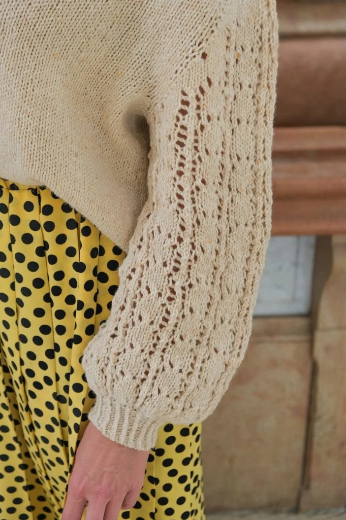 Prosper se tricote de bas en haut : on tricote d’abord le bas du corps en rond, on tricote devant et dos séparément, on assemble les mailles d’épaules à 3 aiguilles avant de relever les mailles autour des emmanchures pour tricoter les manches. Il est orné d’un motif chevrons très facile à réaliser.