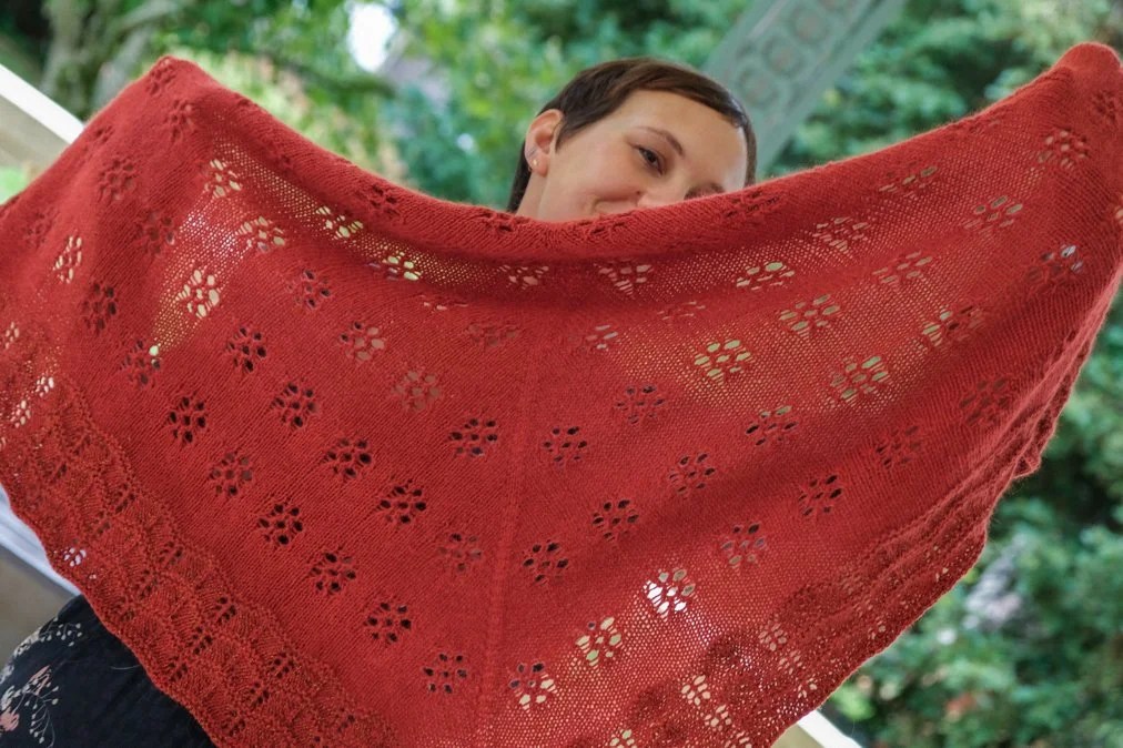 Ce châle se tricote en topdown, c’est à dire qu’on commence par monter les quelques mailles du milieu du grand côté, et qu’on augmente tous les 2 rangs pour faire se déployer l’ouvrage. La partie principale est ornée d’un petit semis de dentelle, la bordure rapportée (c’est à dire qu’on tricote en même temps qu’on rabat les mailles) est travaillée au point mousse ajouré.
