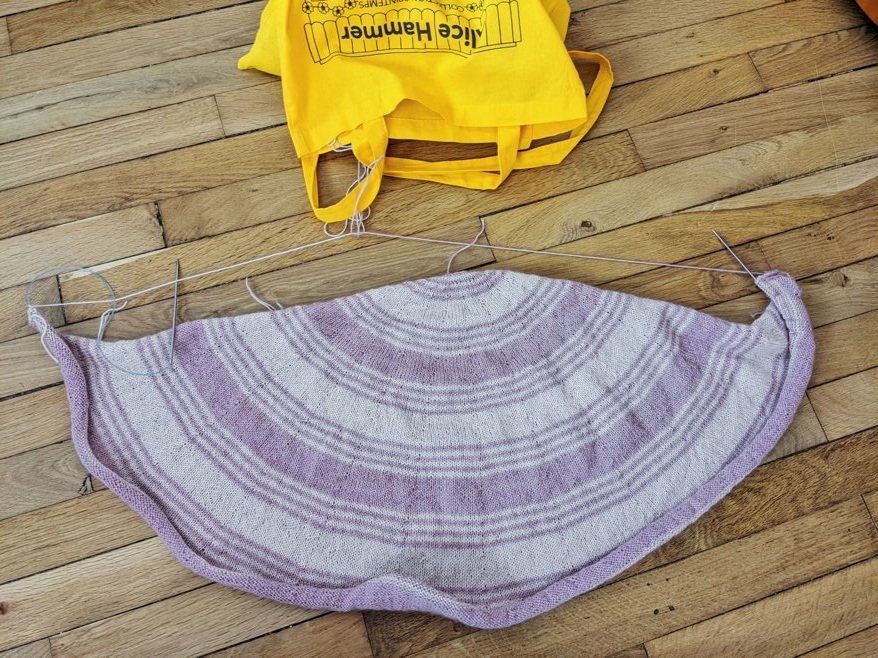 Mon châle en Moustache avance bien, j’ai hâte d’en être à la bordure après cet océan (fort agréable) de jersey.