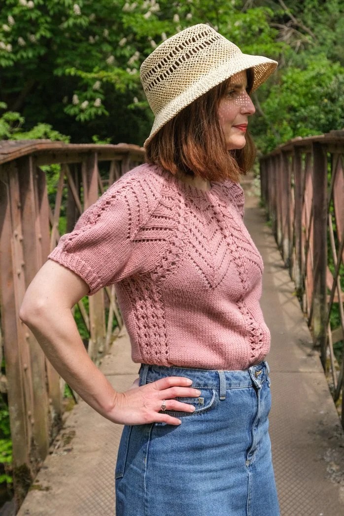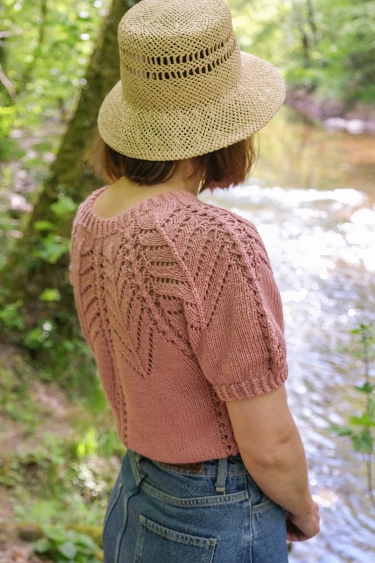 Mitsi se tricote donc en top-down (de haut en bas). Après les côtes on fait quelques rangs raccourcis pour échancrer le col, puis on répète un motif ajouré jusqu’en bas de l’empiècement.