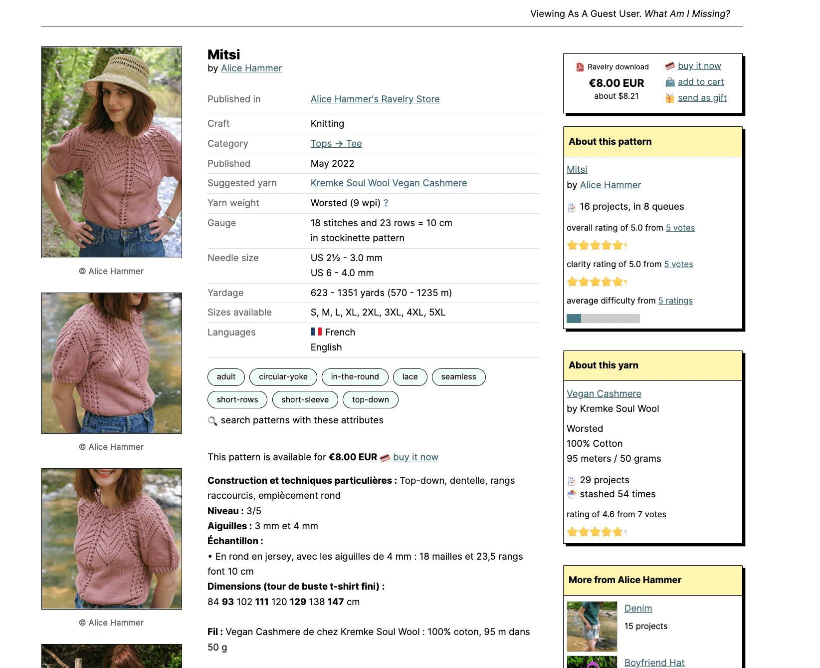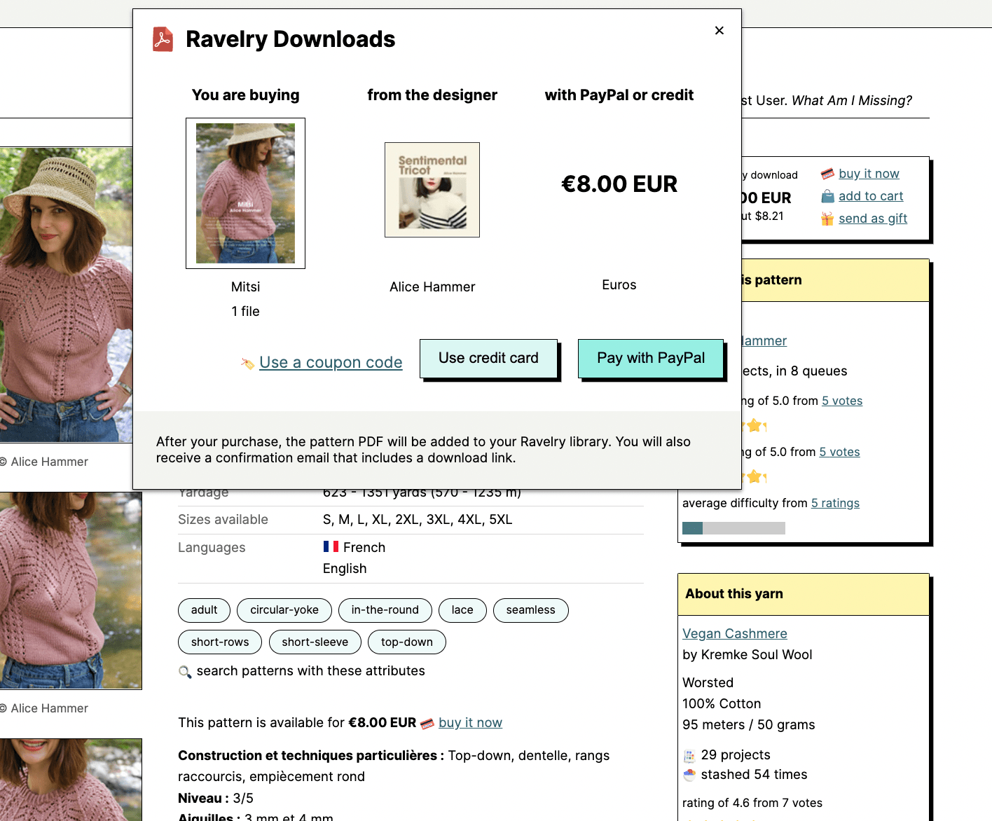 La bonne nouvelle c’est que vous n’êtes pas obligé(e) de vous créer un compte pour pouvoir consulter les modèles en vente sur Ravelry ou pour l’acheter. Vous pouvez vous rendre sur les boutiques des designers, cliquer sur un patron puis le payer par PayPal ou carte bancaire. Vous recevrez un lien après le paiement pour télécharger votre patron au format PDF.