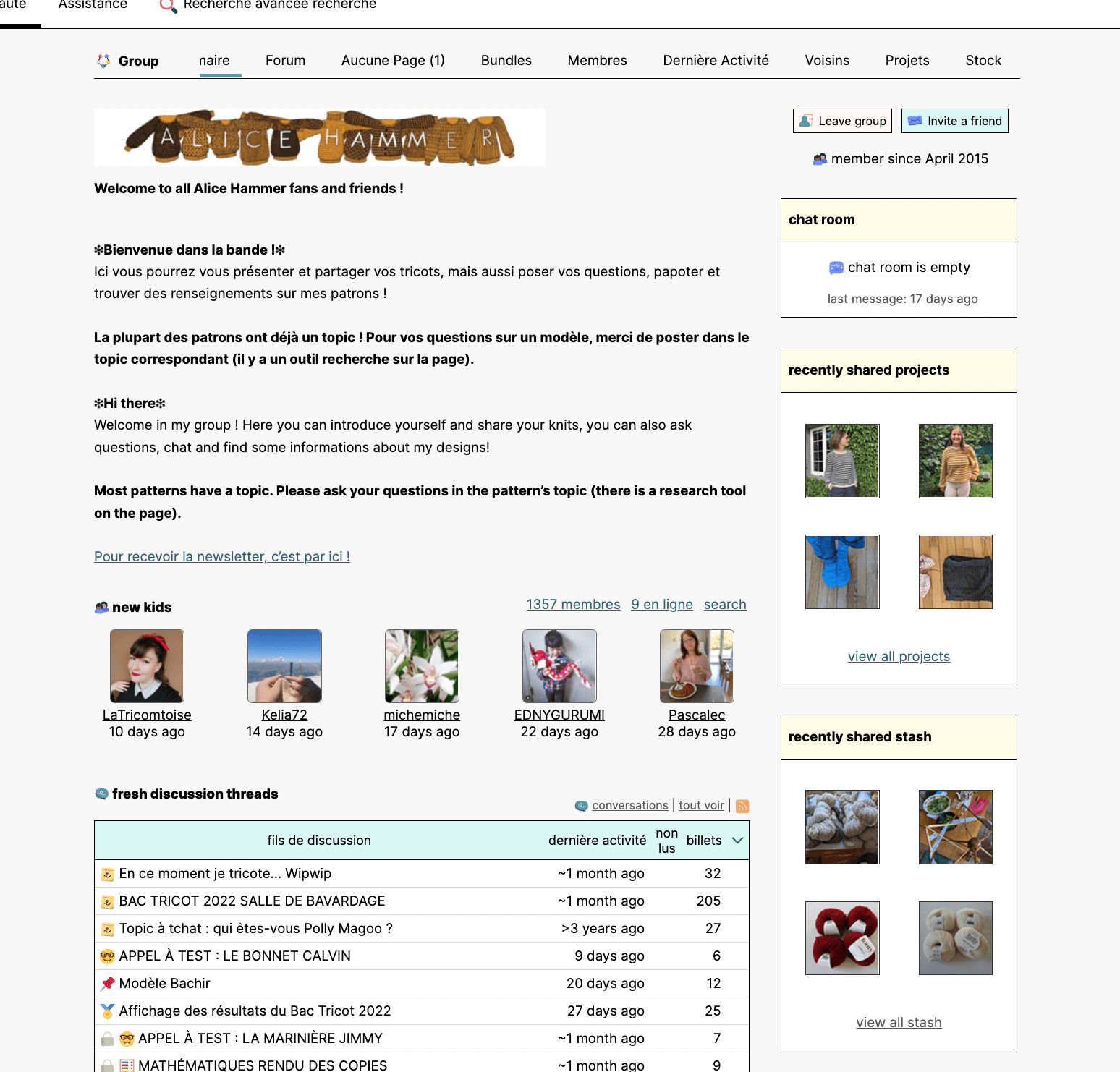 Vous pourrez vous inscrire dans des groupes autour d’un thème ou d’un designer. Par exemple ici sur mon groupe on peut voir tout ce que les membres tricotent, et on peut participer au forum pour poser des questions, voir les questions des autres ou juste papoter. C’est souvent sur les forums Ravelry qu’on organise les Kal (Kal = Knit along, c’est quand on tricote à plusieurs dans un temps donné un modèle ou plusieurs modèles sur un thème c’est très sympa pour échanger).