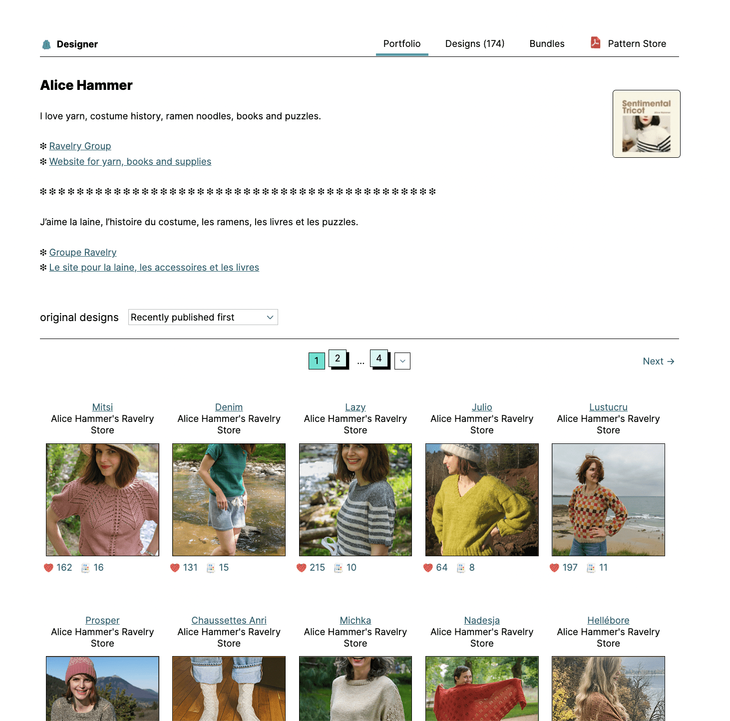 Je fais une toute petite digression avant une visite détaillée de la plateforme pour vous expliquer mon choix de ne plus, pour le moment en tout cas, vendre mes patrons ailleurs que sur Ravelry. Comme je vous l’écrivais la semaine passée je fais la grande remise en question des 10 ans d’activité et j’ai besoin d’aller travailler ailleurs, voir du monde et apprendre de nouvelles choses. Je ne compte pas arrêter de faire des patrons de tricot, mais je vais avoir moins de temps à y consacrer et je souhaite donc simplifier au maximum les parties administration / gestion de ma petite entreprise, partie qui me prenait énormément de temps. Je ne garde donc qu’une plateforme de vente et pour cela Ravelry s’impose face au site internet basique : tout est automatisé, il n’y a jamais de bug, les patrons achetés par les clients sont stockés dans leur bibliothèque et on peut envoyer des mises à jour si on fait une modification sur un modèle. On peut me contacter via la messagerie ou via le forum (le forum c’est super car les questions posées profitent alors à tous). Tout est centralisé et c’est extrêmement pratique pour moi. Par ailleurs je trouve ça très intéressant pour les gens qui veulent tricoter un de mes modèles de voir les versions des autres et de pouvoir échanger avec eux.