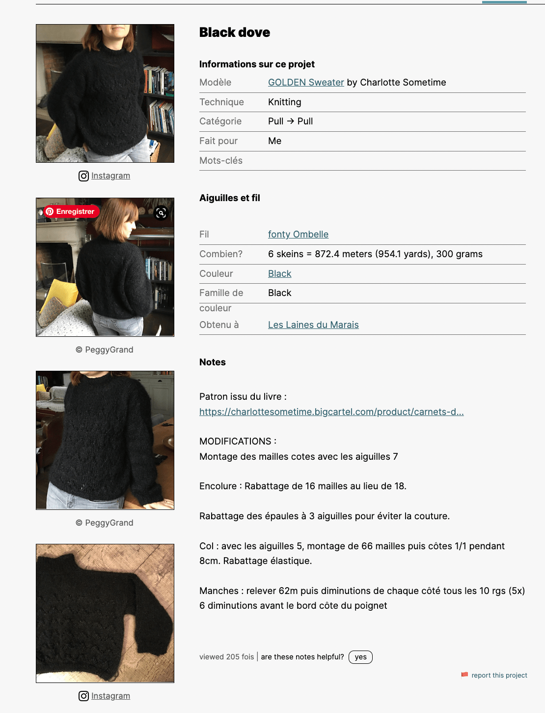 Vous pourrez créer des « projets ». Quand vous créez un projet vous y reliez le patron et le fil que vous utilisez, vous pouvez noter toutes les infos que vous voulez : votre échantillon, votre taille d’aiguilles, vos modifications ou remarques… Les fiches projet sont très utiles pour vous mais surtout pour les autres. En effet, quand vous créez un projet à partir d’un patron, il sera alors visible depuis la page du patron chez le designer !