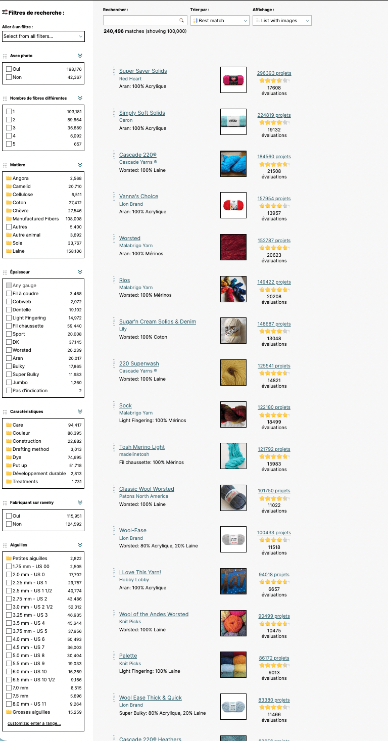 La partie « fils » est également très pratique : vous pouvez rechercher les fils correspondant à tous les critères que vous cochez. Par exemple si vous cherchez un fil alpaga bouclé qui se tricote en 5 mm, vous choisissez toutes ces options et vous verrez apparaitre la liste des fils qui correspondent à cette description.