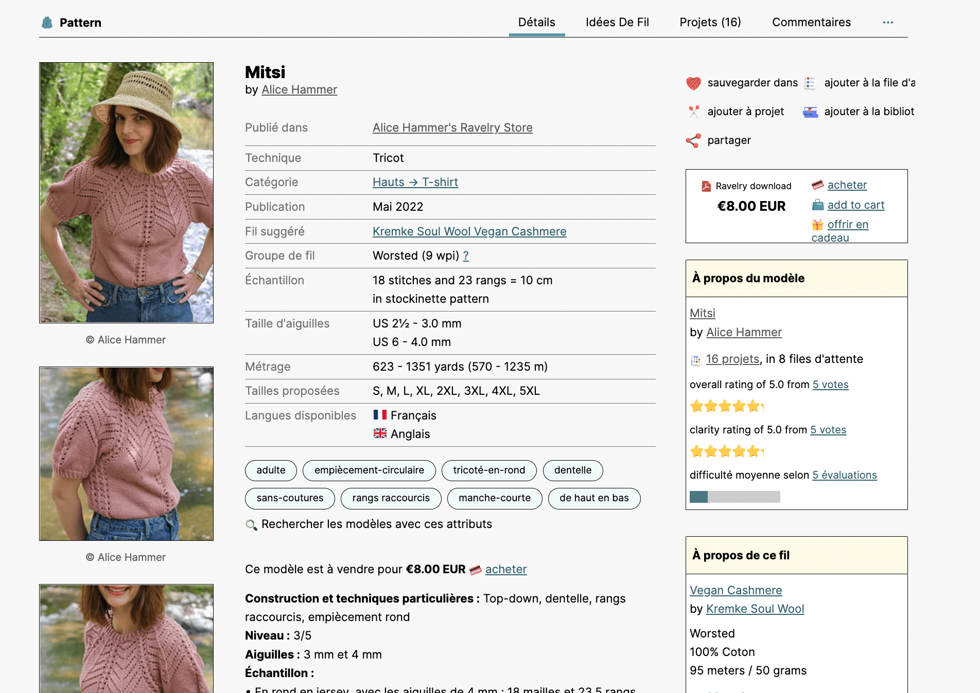 Ravelry permet de voir les modèles portés, par de « vraies personnes » (je mets des guillemets car les designers ne sont pas de fausses personnes je pense que vous voyez très bien ce que je veux dire par là) dans différentes tailles, différents coloris et tricotés avec différents fils. Ça c’est pour moi un outil fabuleux aussi bien pour les clients que pour nous les créateurs.